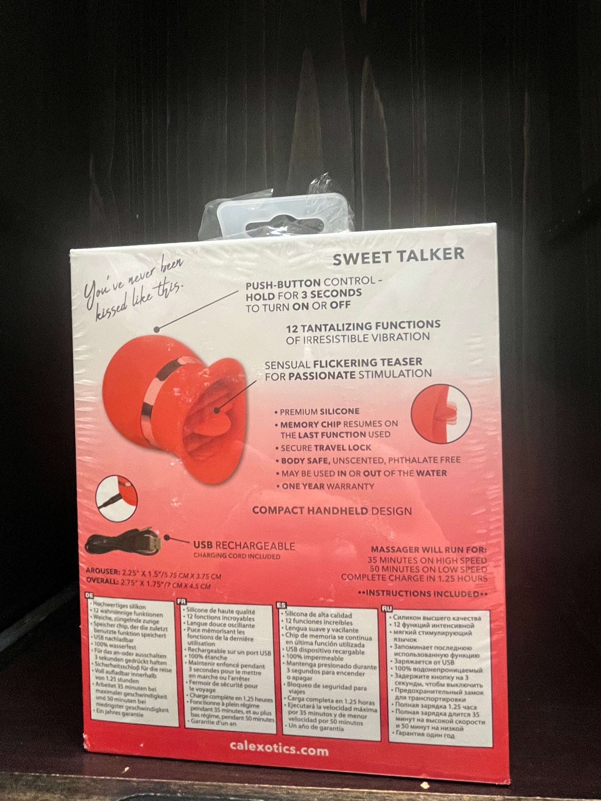 Experience mind-blowing pleasure with the CalExotics French Kiss Sweet Talker Clitoral Vibe. Its cupped, widespread tip surrounds your sensitive areas while ribs and a tiny tongue provide unique sensations in 12 exciting rhythms. Made of hypoallergenic silicone, it's easy to clean and rechargeable with any USB port. Use with your favorite water-based lube for ultimate pleasure.