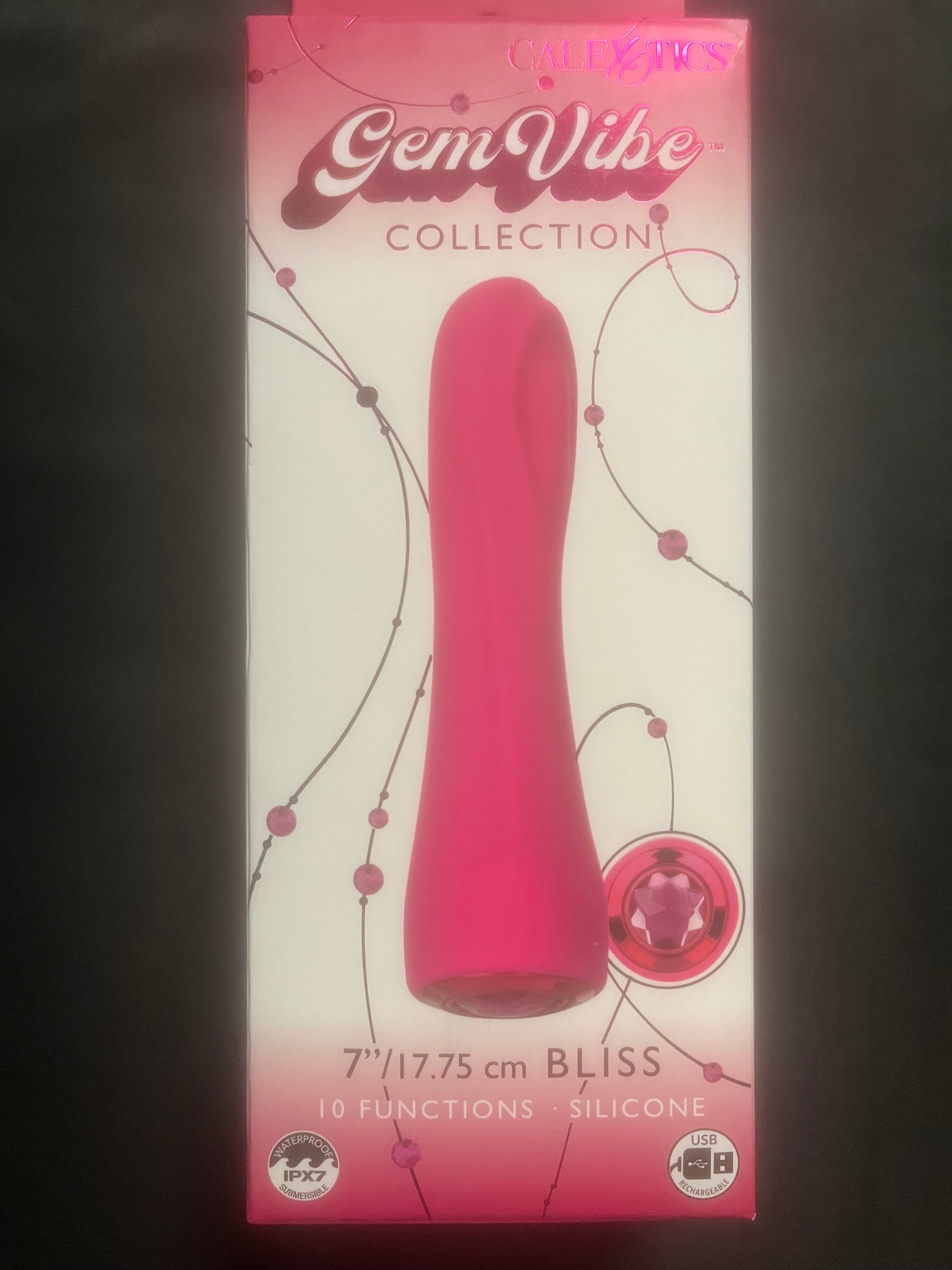 Indulge in the ultimate pleasure with the CalExotics Gem Vibe Collection Bliss Vibe! This versatile toy features a G-spot, P-spot, and A-spot seeking shape for explosive orgasms. With ten powerful vibration modes and a sparkly design, this vibe is perfect for clitoral and nipple stimulation. Made with hypoallergenic materials and easy to clean. USB rechargeable and waterproof for convenient use. Experience pure bliss with every touch!