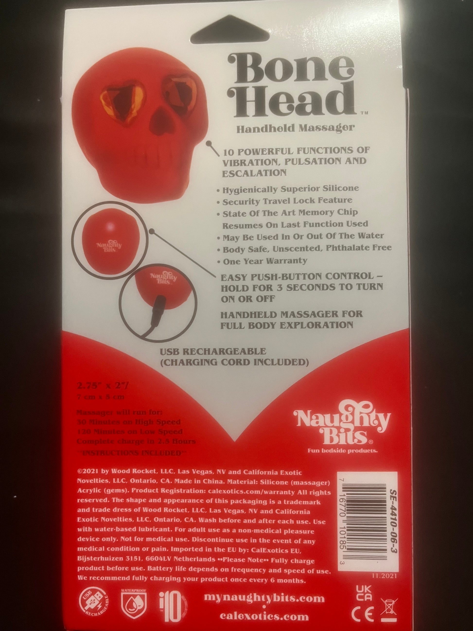 Get ready for some spooky fun with the CalExotics Naughty Bits Bone Head Vibe! With a petite shape that's easy to hold onto, this vibe features ten intense modes of vibration for ultimate pleasure. The sparkling rhinestone eyes add a touch of glamour, while the strategic texturing targets your sweet spots. Don't miss out on this thrilling experience!