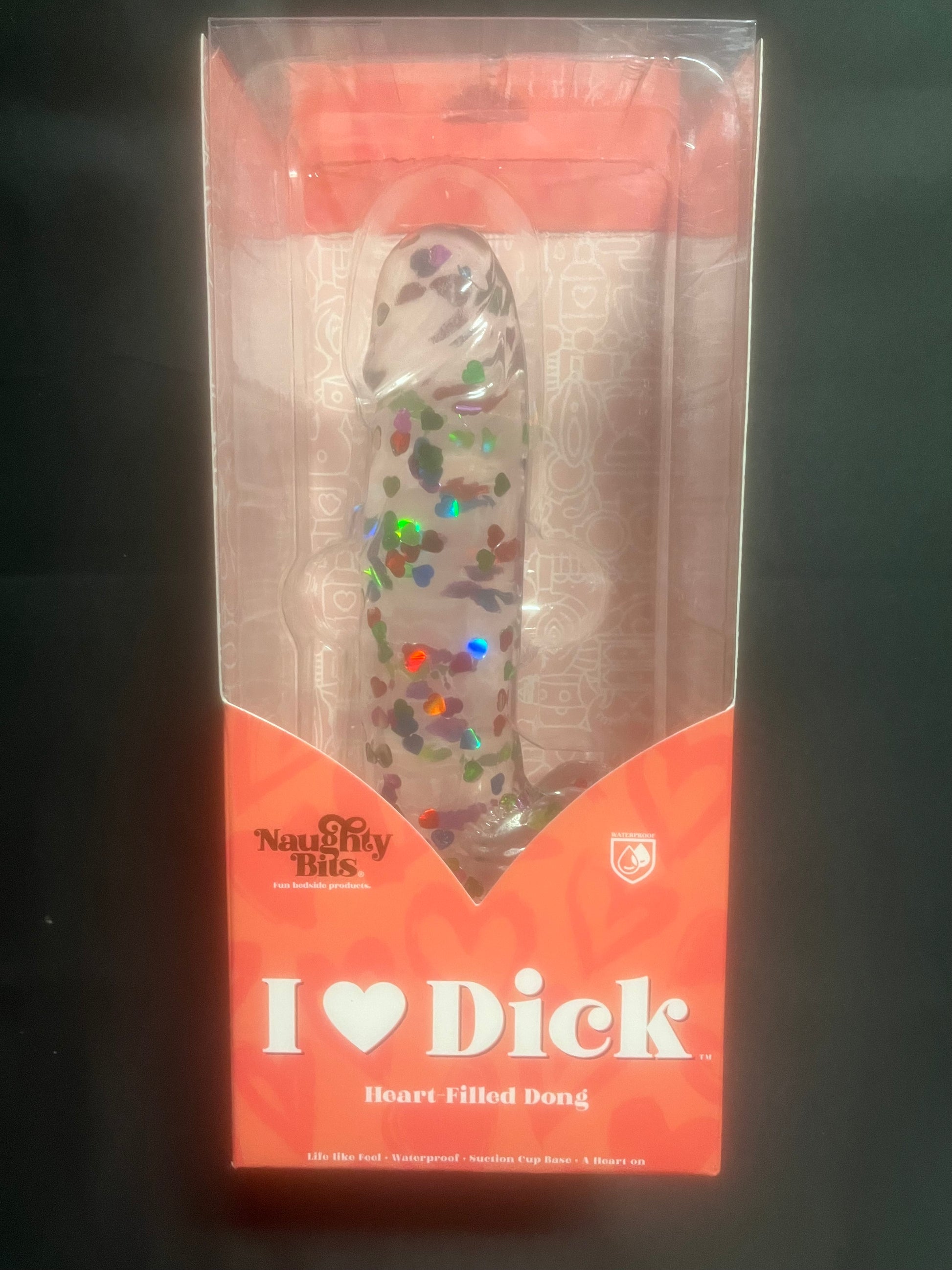 Introducing the calexotics Naughty Bits I ♥ Dick 6 Inch Dildo - the ultimate pleasure seeker that will leave you in love at first sight. With glittery hearts and lifelike design, it's versatile shape and circular base will target and satisfy your deepest desires. Compatible with strap-ons or use the suction cup for hands-free fun.