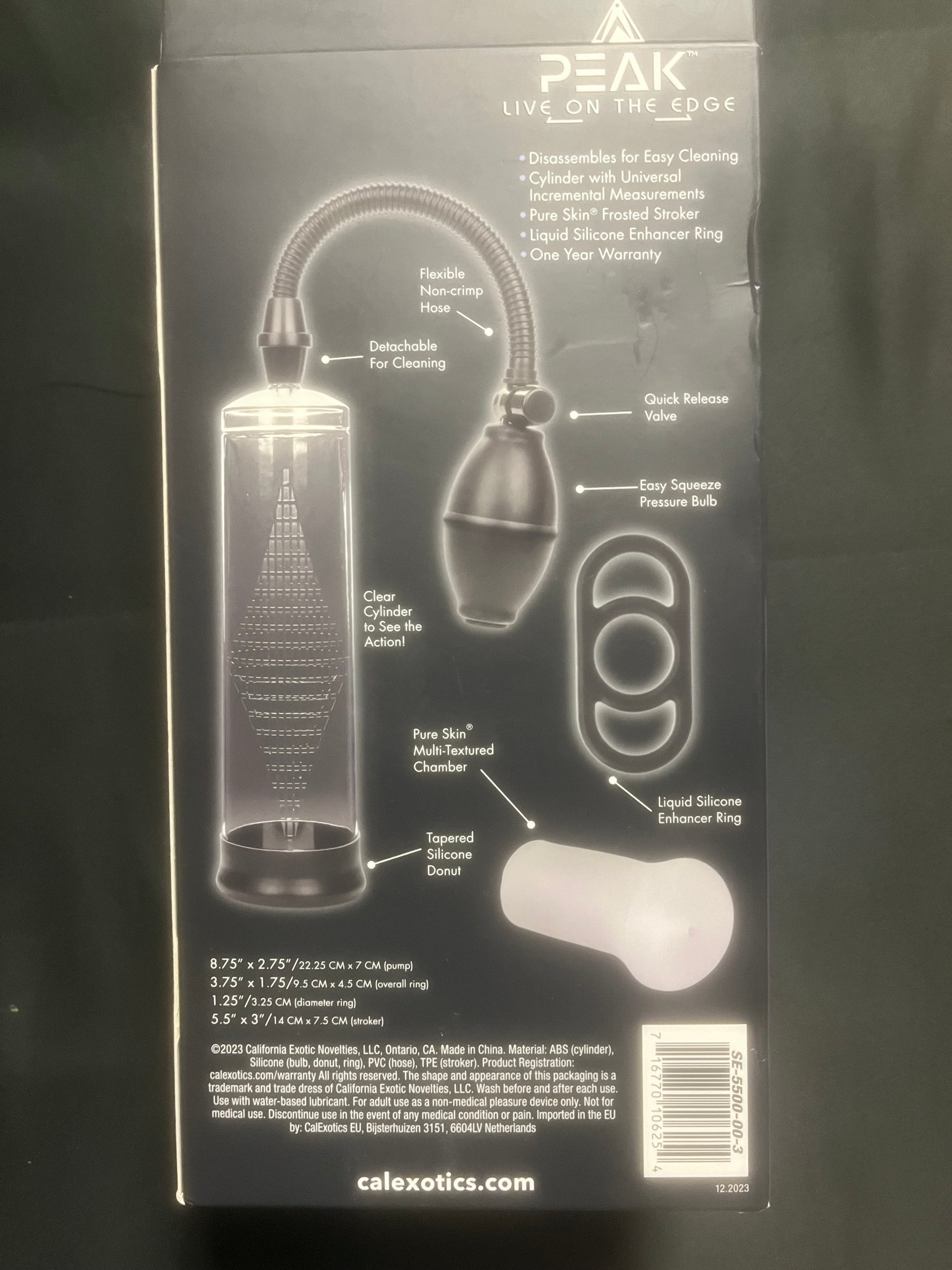 Experience intense pleasure and build stamina with CalExotics Peak Live On the Edge Edging Kit. The super-snug Pure Skin stroker provides stimulating texture, while the sturdy ABS plastic and silicone pump and ring are body-safe and easy to clean. Add slipperiness with your favorite water-based liquid for maximum pleasure.