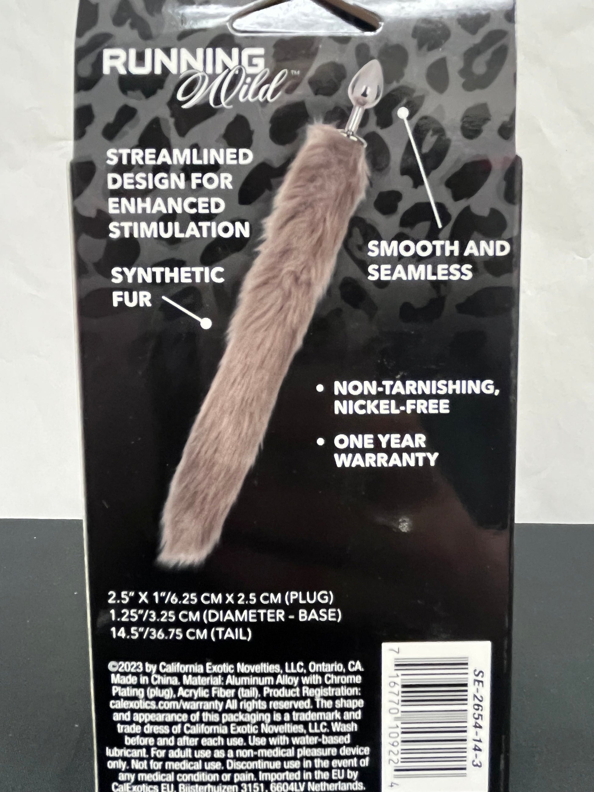 Set out on a wild adventure with CalExotics' Running Wild Tail Plug! Made of smooth aluminum with a tapered tip for easy insertion and a wide base for safe play, this plug also features a long faux fur tail perfect for sensory stimulation. Use with any lubricant and easily clean with soap and water. Indulge in your playful imagination today!