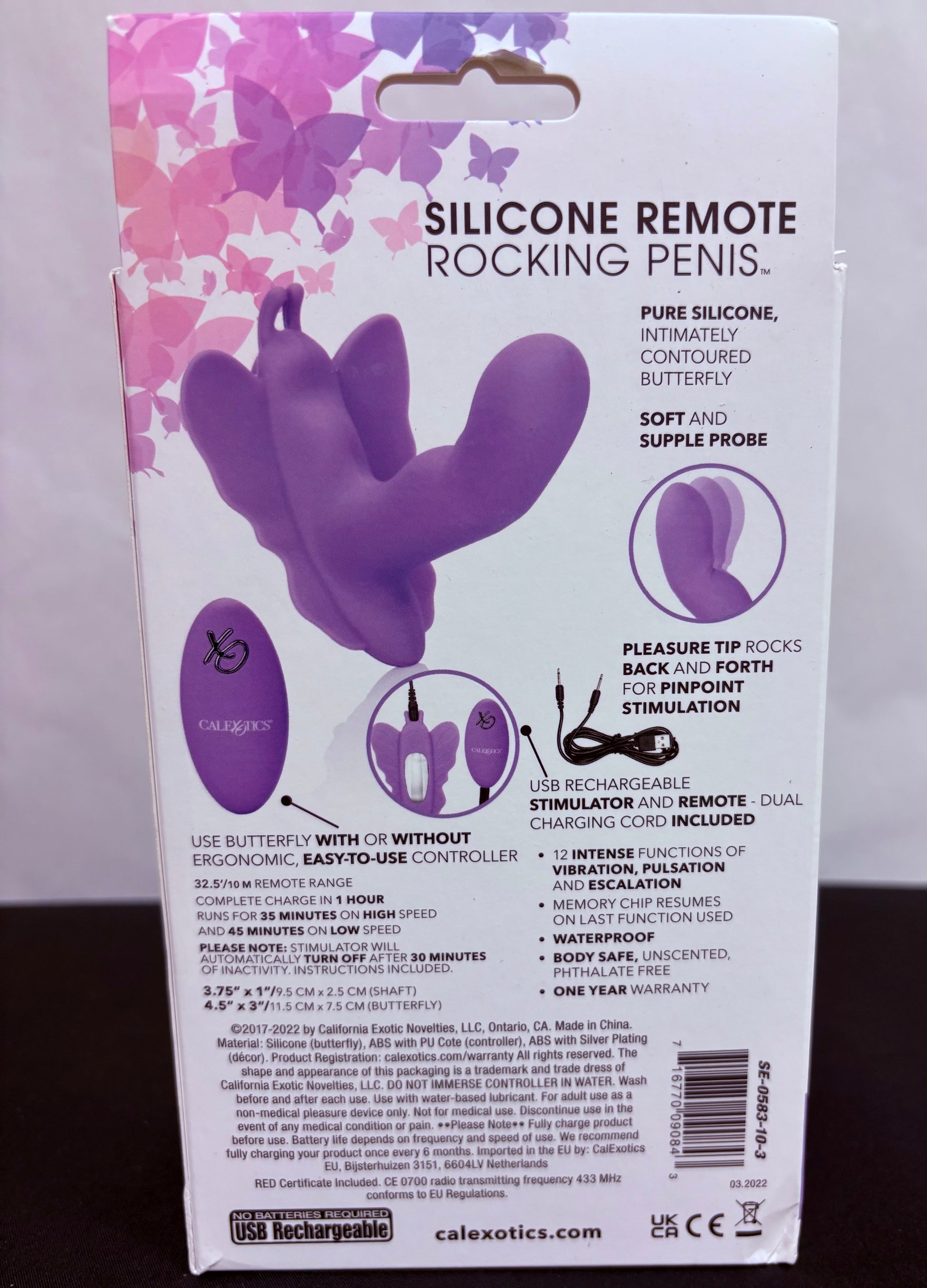 Experience a luxurious, wearable pleasure with CalExotic's Remote Rocking Venus Penis. This innovative design offers hands-free stimulation and can easily be held in hand or discreetly worn under clothing. With a soft butterfly shape and a powerful silicone penetrator, this toy is perfect for stimulating outer sweet spots and g-spot magic. Featuring twelve throbbing vibration modes and a unique 'come-hither' motion, this toy will leave you breathless and ready for more. The included remote allows for easy control from up to 32.5'/10m away, or you can use the push buttons on the butterfly itself for solo play. With a rechargeable battery and easy cleaning, this toy is a must-have for any pleasure seeker. Indulge in the ultimate sensual experience with the Remote Rocking Venus Penis. water-based lubricant- avoid contact with silicone lubes and products. Waterproof.
