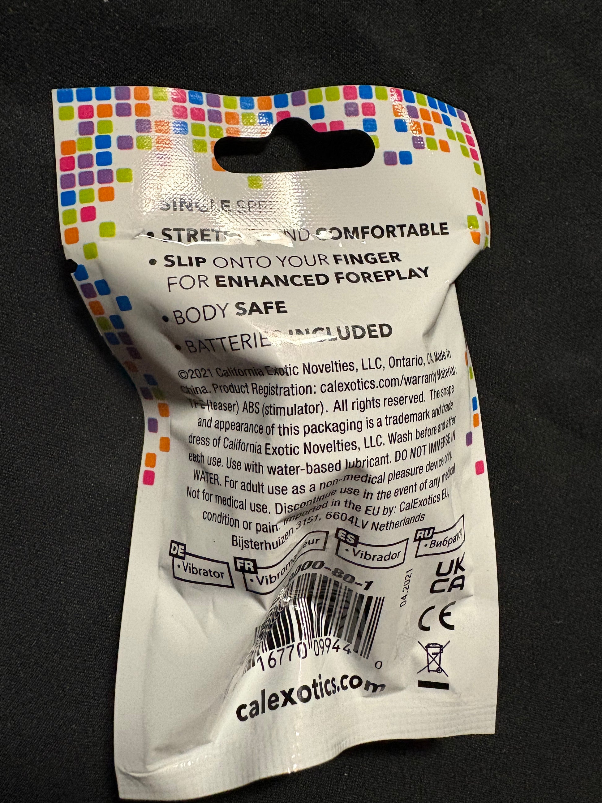 Discover the power of small with the CalExotics Vibrating Finger Teaser in Blue. With one steady mode of vibration, this tiny and discreet toy is perfect for targeting sweet spots such as penis tips, clitorises, nipples, or butts. Made from phthalate-free materials, it's body-safe and low maintenance. Simply flip the switch and enjoy!