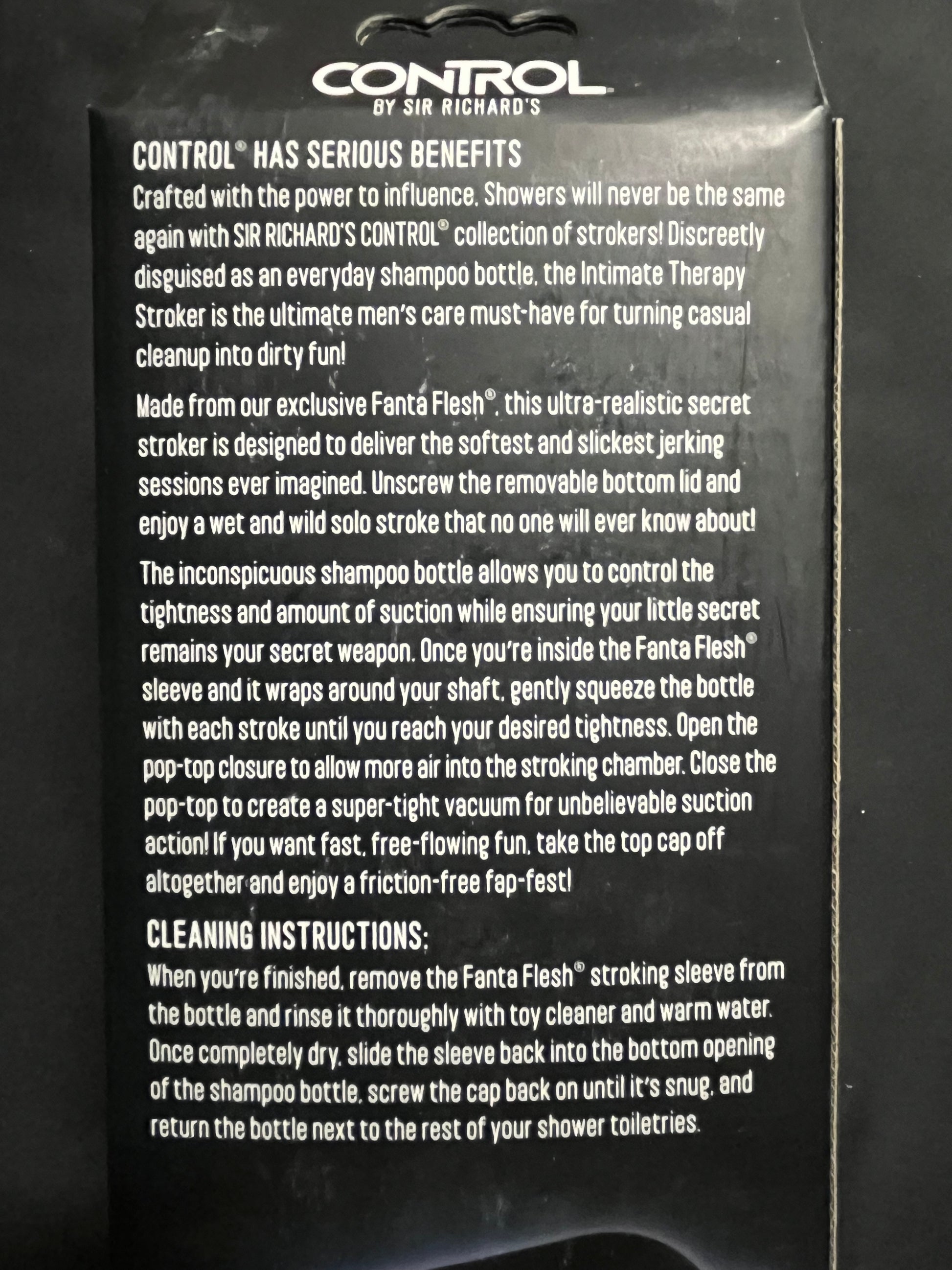 Experience ultimate pleasure with the Control Intimate Therapy Anal Stroker! Open up the base to reveal a lifelike anal sleeve, lined with stimulating texture for intense sensations. Adjust the pressure by removing the bottle-shaped casing. Made of Fanta Flesh and ABS plastic, it's easy to clean and compatible with any water-based lube.