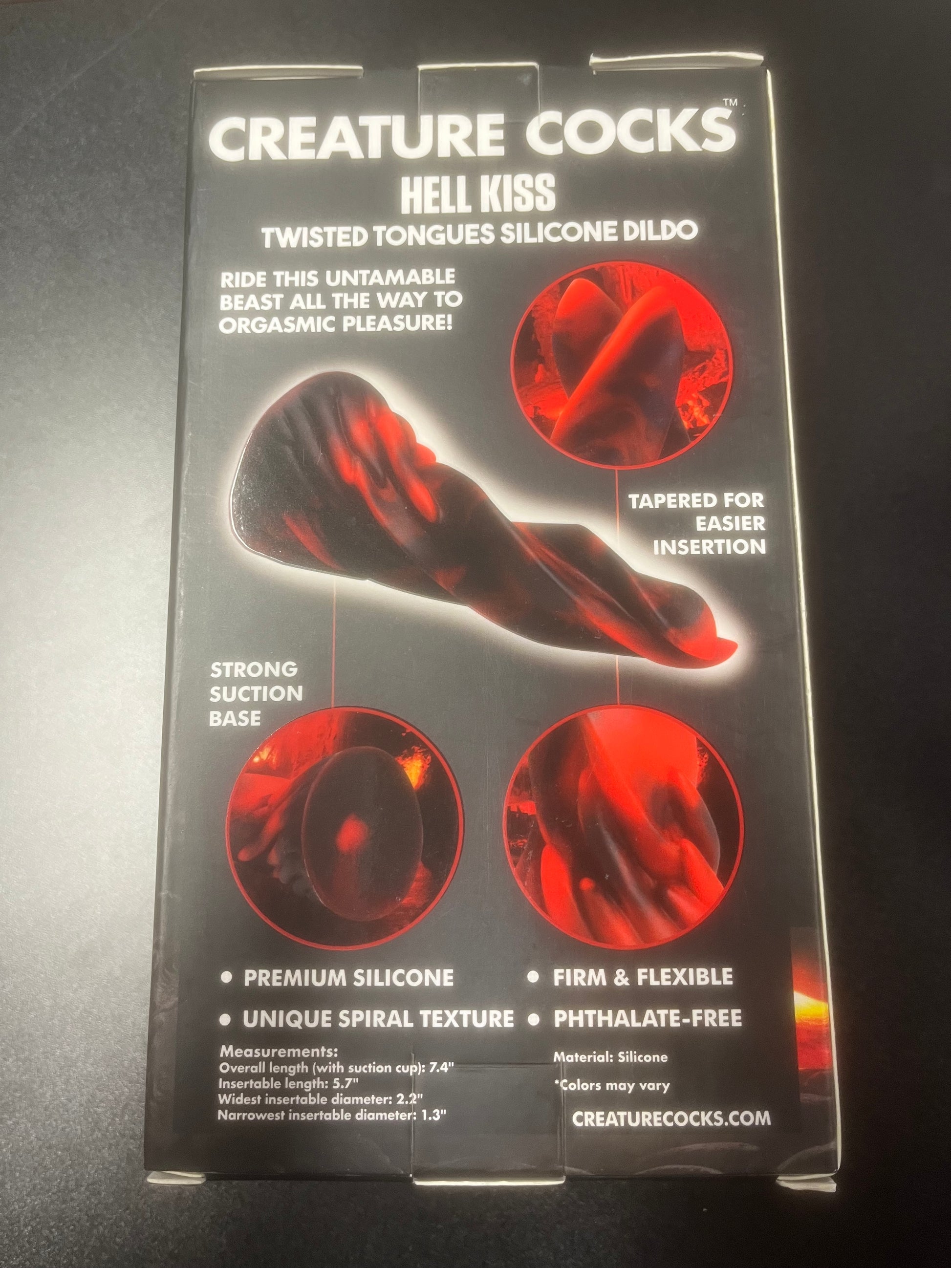 Experience the heat without the burn with Creature Cocks' Hell Kiss Twisted Tongues Dildo. The devilishly twisted texture and satisfying size will have you screaming for more. With sturdy suction, hands-free play is a breeze. Made of hypoallergenic silicone for easy cleaning.