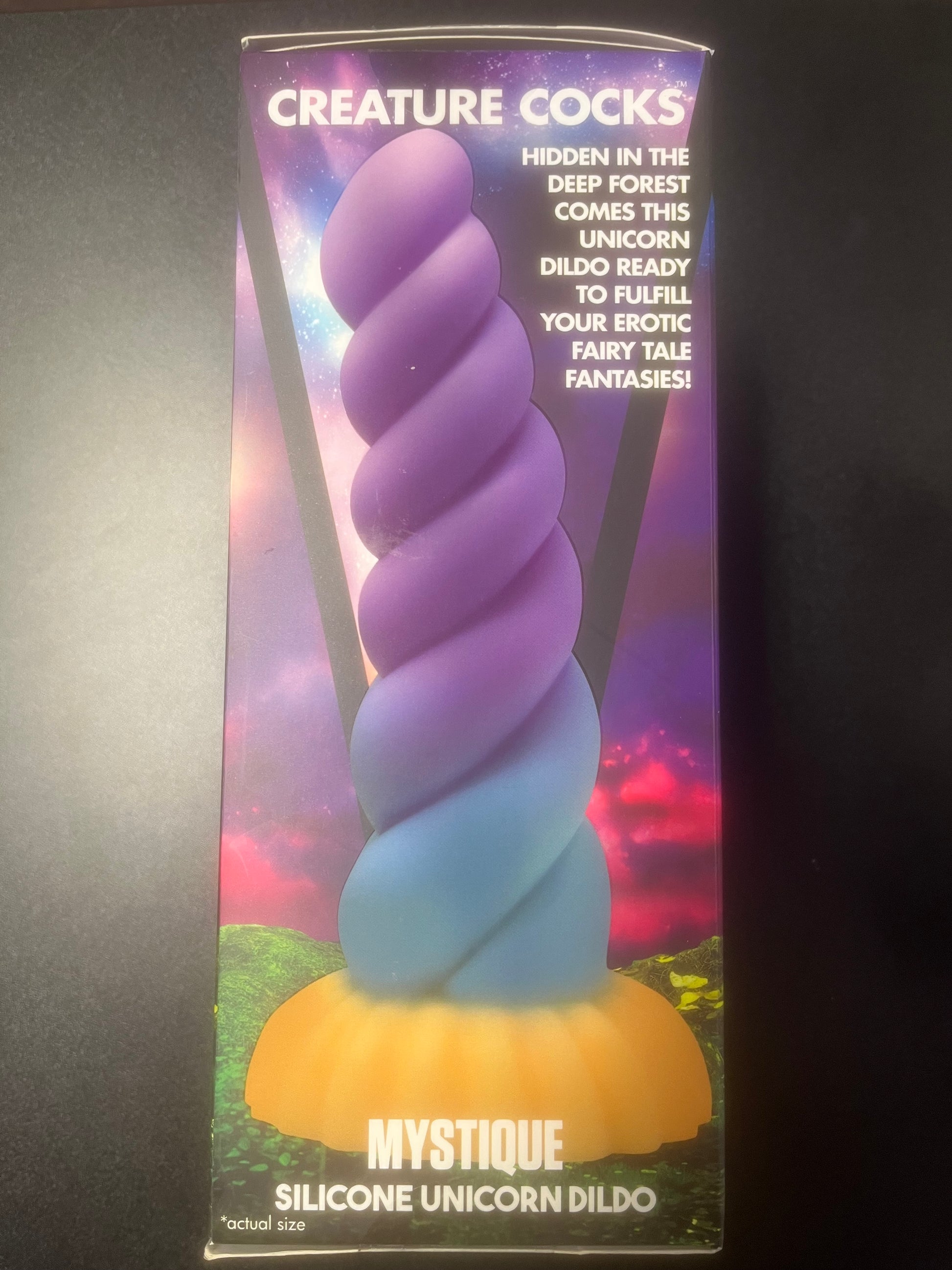 Take your pleasure to mythical heights with the Creature Cocks Mystique Unicorn Silicone Dildo. Its unique shape and spiral texture provide intense sensations while the extra thickness adds to the experience. With a strong suction cup base, this dildo can be used hands-free on various surfaces or easily incorporated into strap-on play. The possibilities for pleasure are endless.