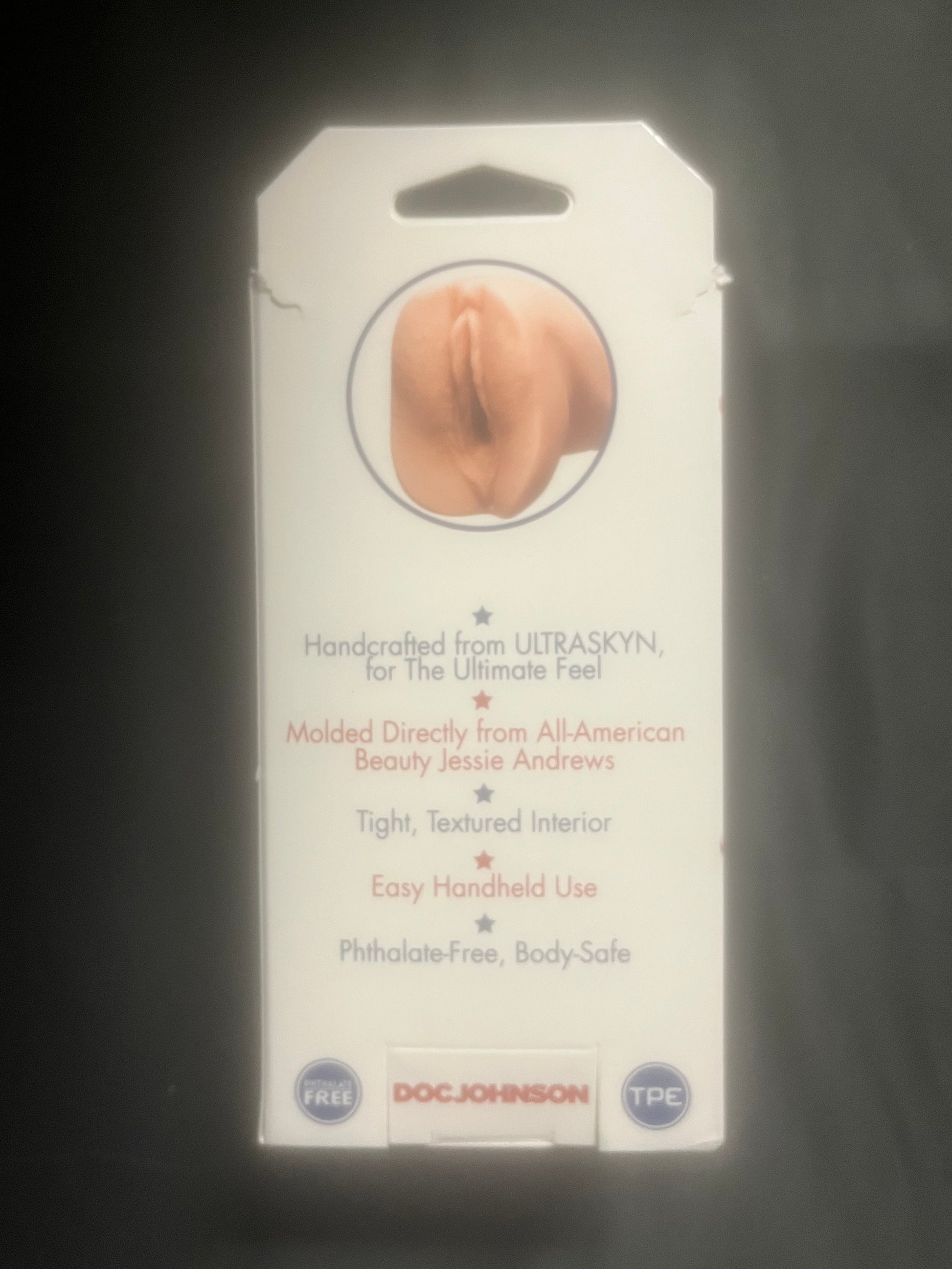 Experience the ultimate pleasure with Doc Johnson Jessie Andrews The All American Masturbator. Made with patented ULTRASKYN material, this stroker is soft and supple, offering a ribbed inner texture for intense friction. Portable and versatile, it's perfect for solo play or a hand-job helper. The body-safe construction and open-ended design make it easy to clean and compatible with water-based lubricants. Feel the sensation of Jessie Andrews' vagina in your hand.