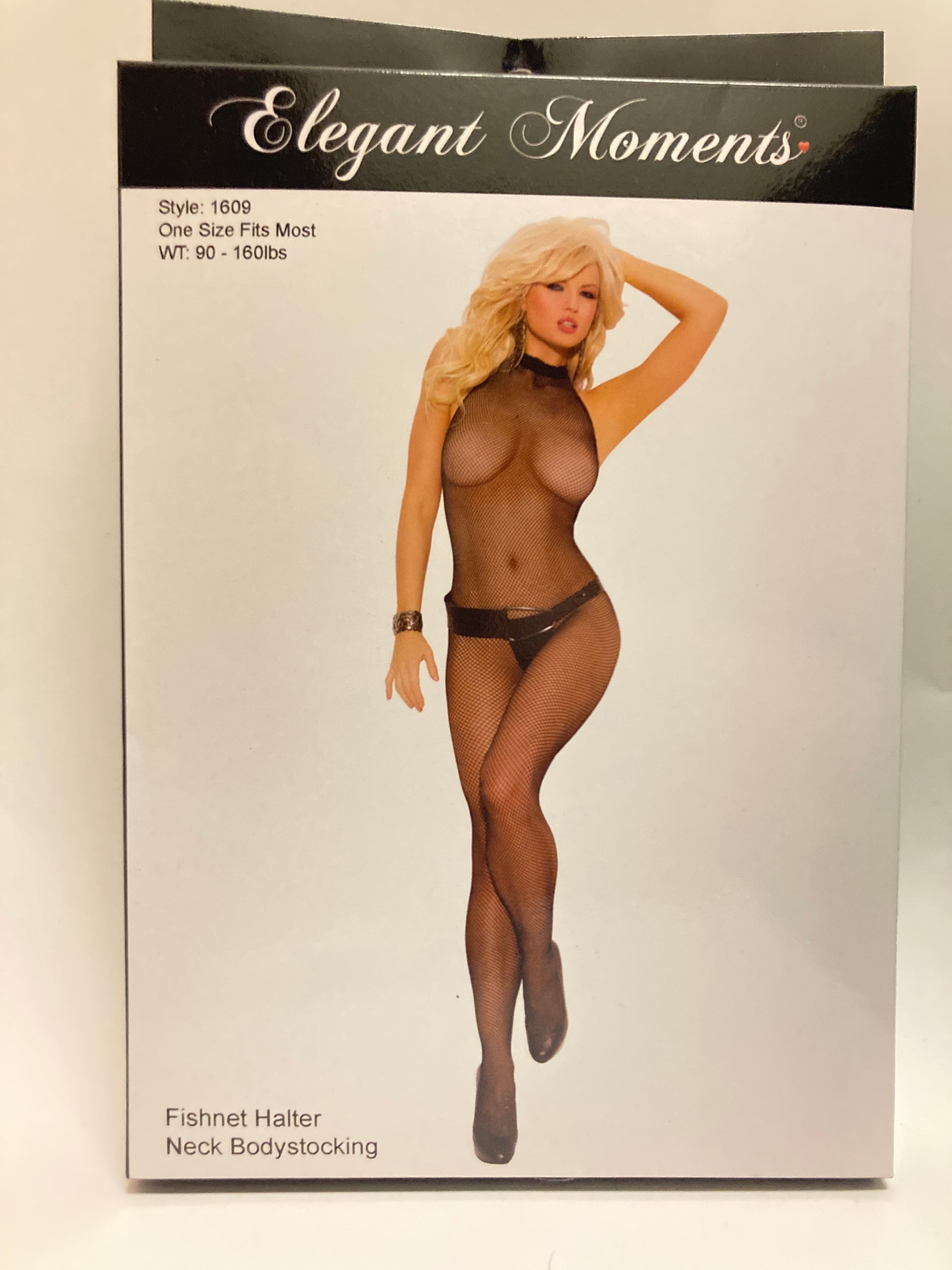 Get ready to party in style with this Elegant Moments Black Lace Neck Halter-Net Bodystocking! This stunning bodystocking features a lace choker fit and is completely sheer from head to toe. Plus, the crotchless design makes it perfect for a night in or out. One size fits most. Hand wash cold, line dry. 100% Nylon.