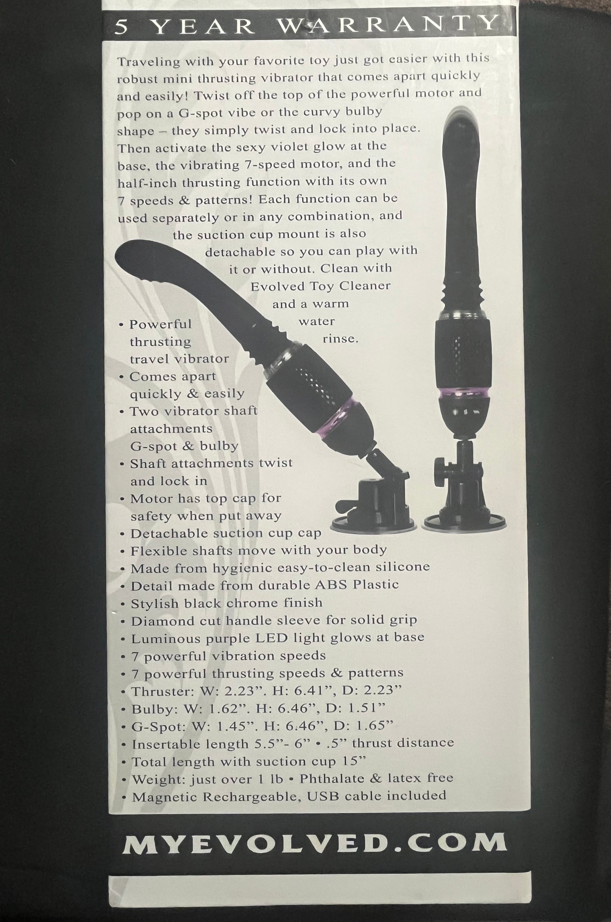 Experience extreme pleasure and perfect play with Evolved's Thrust & Go Mini Thrusting Vibe. With powerful thrust and vibration capabilities, this portable device can be used hands-free for maximum enjoyment. Perfect for any playful scenario, let's talk about the driving force behind your pleasure.