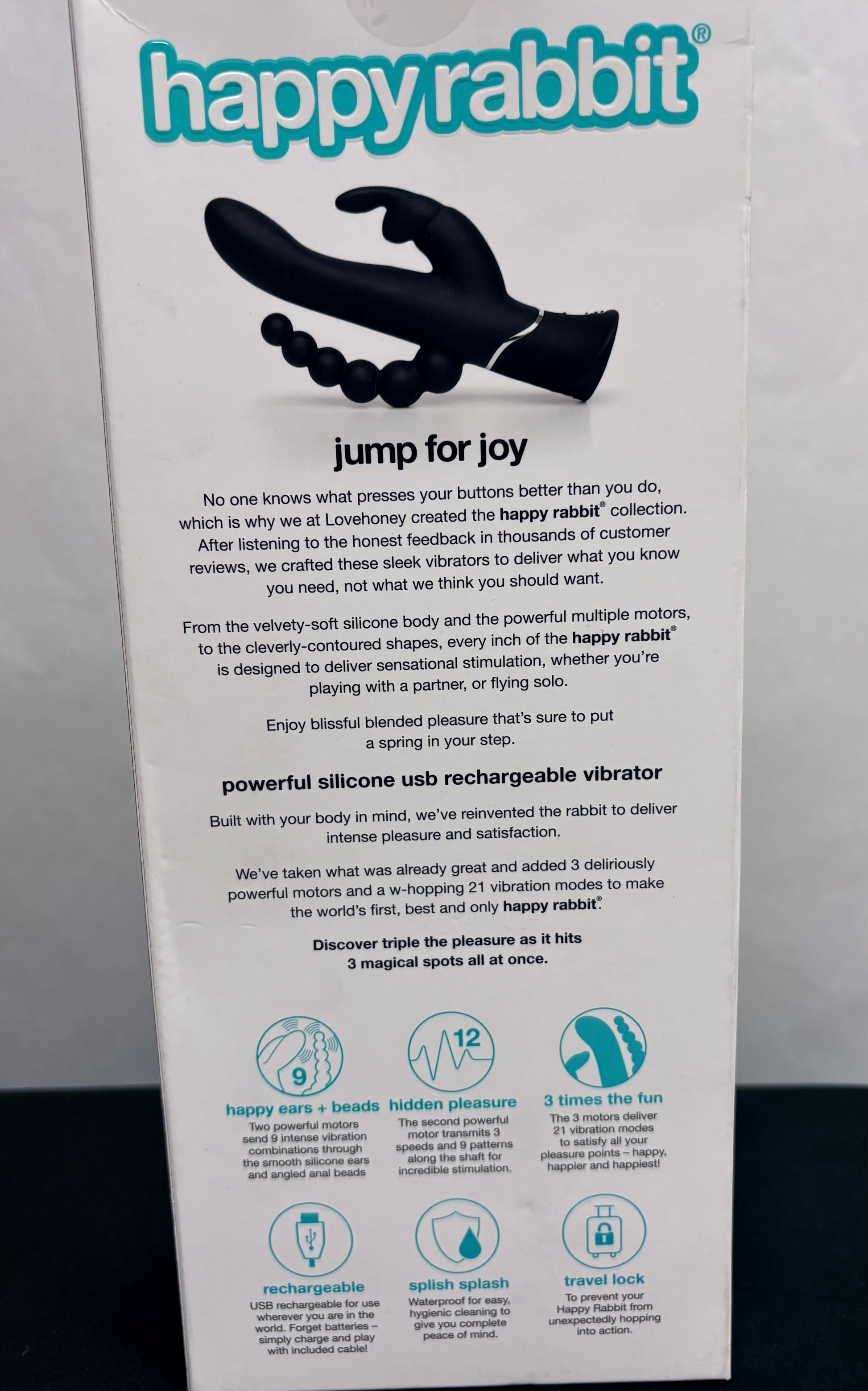Experience the ultimate pleasure with Happy Rabbit's Triple Vibrator. This luxurious toy targets all three of your sweet spots simultaneously for an intense and satisfying experience. The smooth and curved design is perfect for reaching your G-spot, A-spot, and other inner hot spots. Not only that, but the flexible bunny teaser and beaded butt tickler provide external stimulation for even more pleasure. With nine vibration settings for both the penetrator and tickler, you can customize your pleasure just the way you like it. The pure silicone material is body-safe, easy to clean, and compatible with all water-based lubricants. Plus, with a built-in travel lock and USB rechargeability, this vibrator is perfect for on-the-go pleasure. Don't wait any longer, treat yourself to the Happy Rabbit Triple Vibrator today!