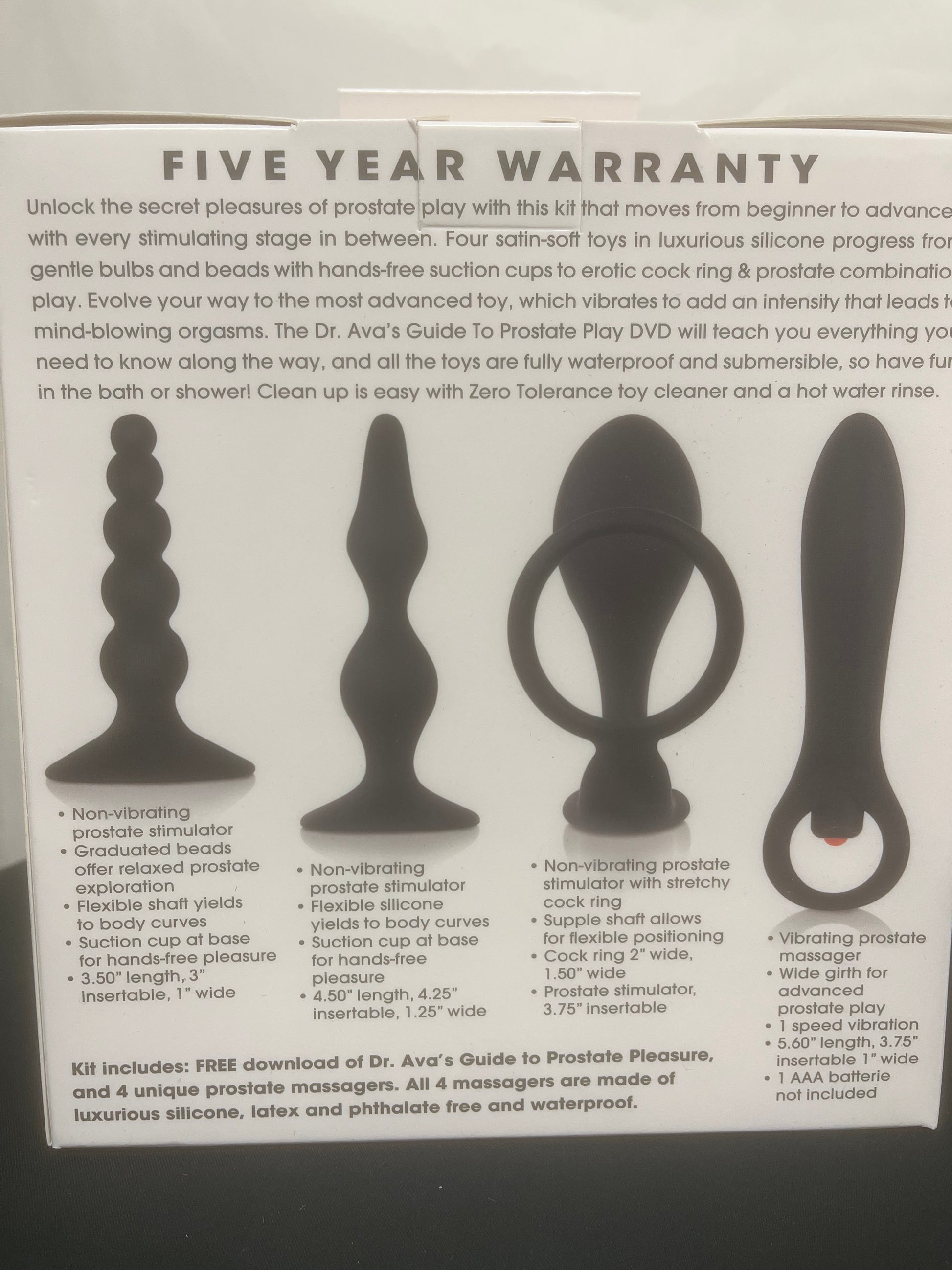 Explore and enjoy the pleasures of anal play with the Intro to Prostate Kit. This comprehensive kit includes four specially designed pieces to stimulate the male G-spot. From beginner to advanced, experience simple, manageable pleasure with two silky silicone plugs, a p-spot stimulator with attached cock ring, and a curved vibe for inner anal sweet spots.