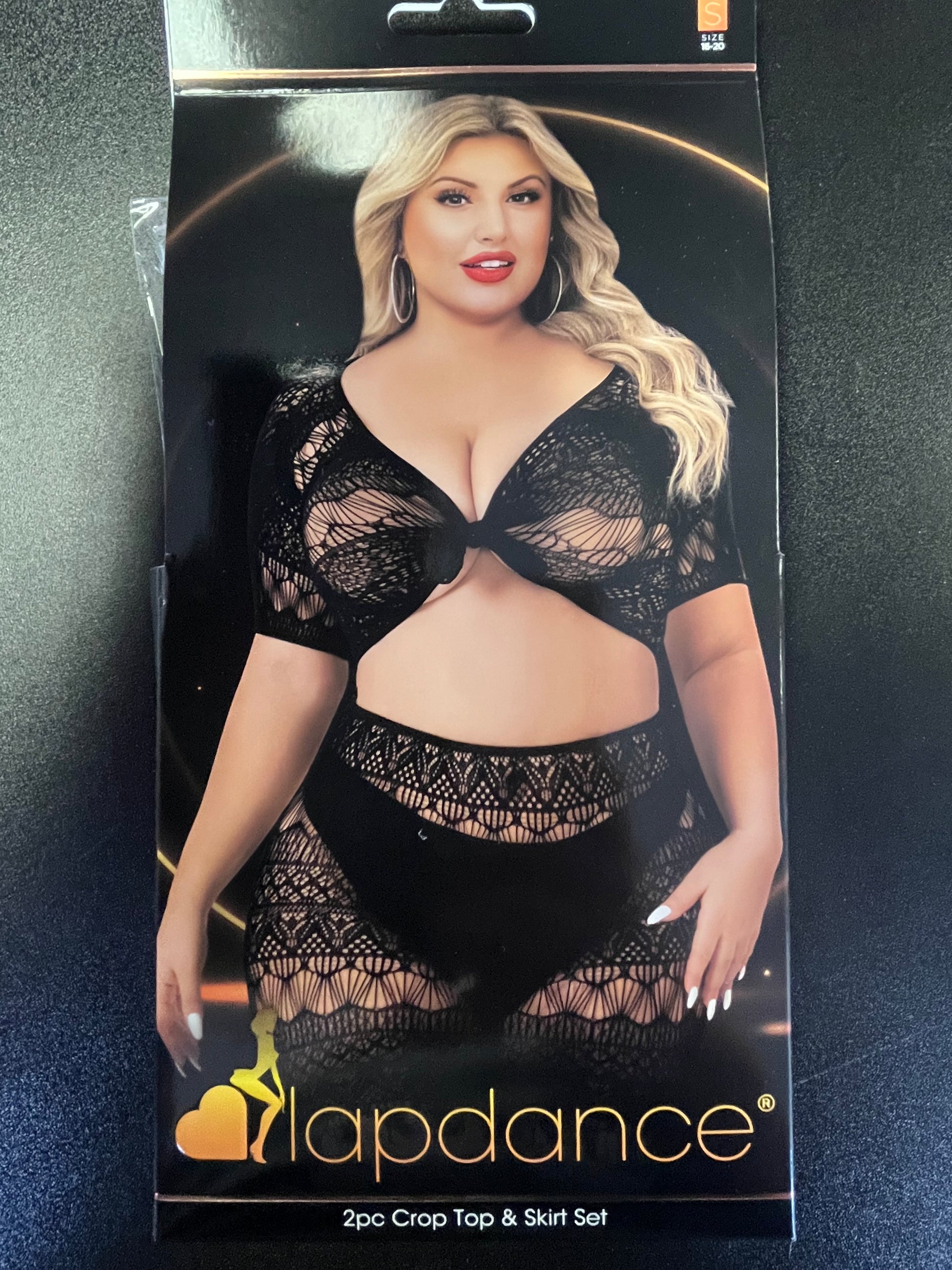 Experience sultry and daring style with Lapdance Lingerie's two-piece set. Show off your midriff with the seductive tie in the front of the sleek black crop top and matching skirt. The see-through patterned fabric teases just the right amount of skin, while frayed edges add an edgy touch to the bold aesthetic. Make a statement and radiate confidence with this alluring lingerie set.