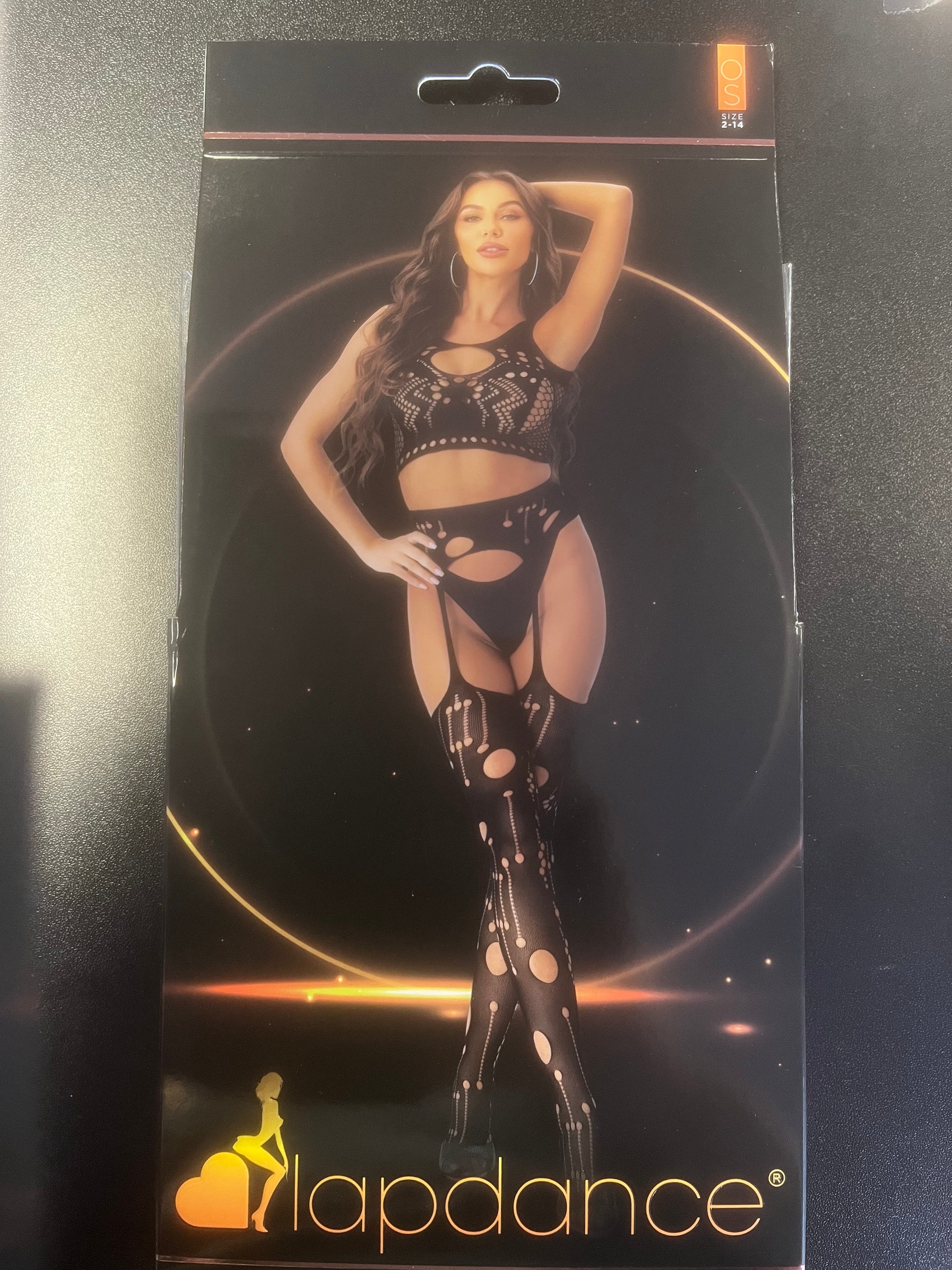 Indulge in the captivating and sensual Lapdance 2pc Crop Top & Garter Hose Set LC127. This stunning ensemble, made from a comfortable and stretchy blend of nylon and spandex, combines bold design with an elegant touch. Varying-sized patterned cutouts throughout create an alluring peek-a-boo effect, while the crop top flatters the bust and the attached garter hose elongates the legs for a truly captivating look. This set is perfect for those who exude confidence and crave seductive style in every detail.
