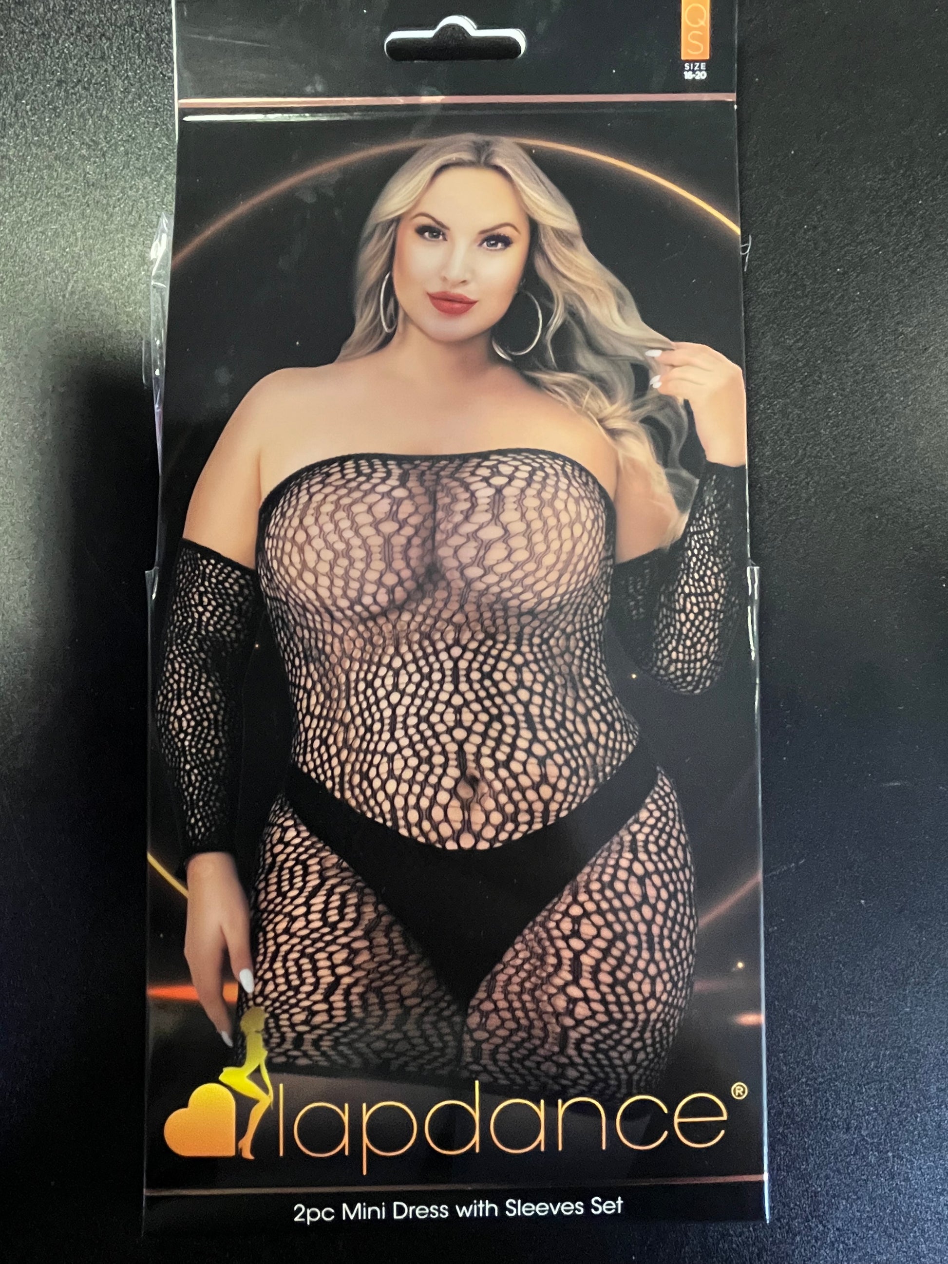 The Lapdance Lingerie two-piece mini dress with sleeves set is a seductive and captivating ensemble that reveals just enough to entice the imagination. Crafted from a luxurious blend of nylon and spandex, this black outfit boasts a captivating pattern of different-sized holes, creating a mesmerizing peek-through effect. The form-fitting mini dress accentuates every curve, while the included sleeves add an edgy touch of sophistication. Perfect for those who want to make a bold and unforgettable statement, this set is designed to showcase all that lies beneath.