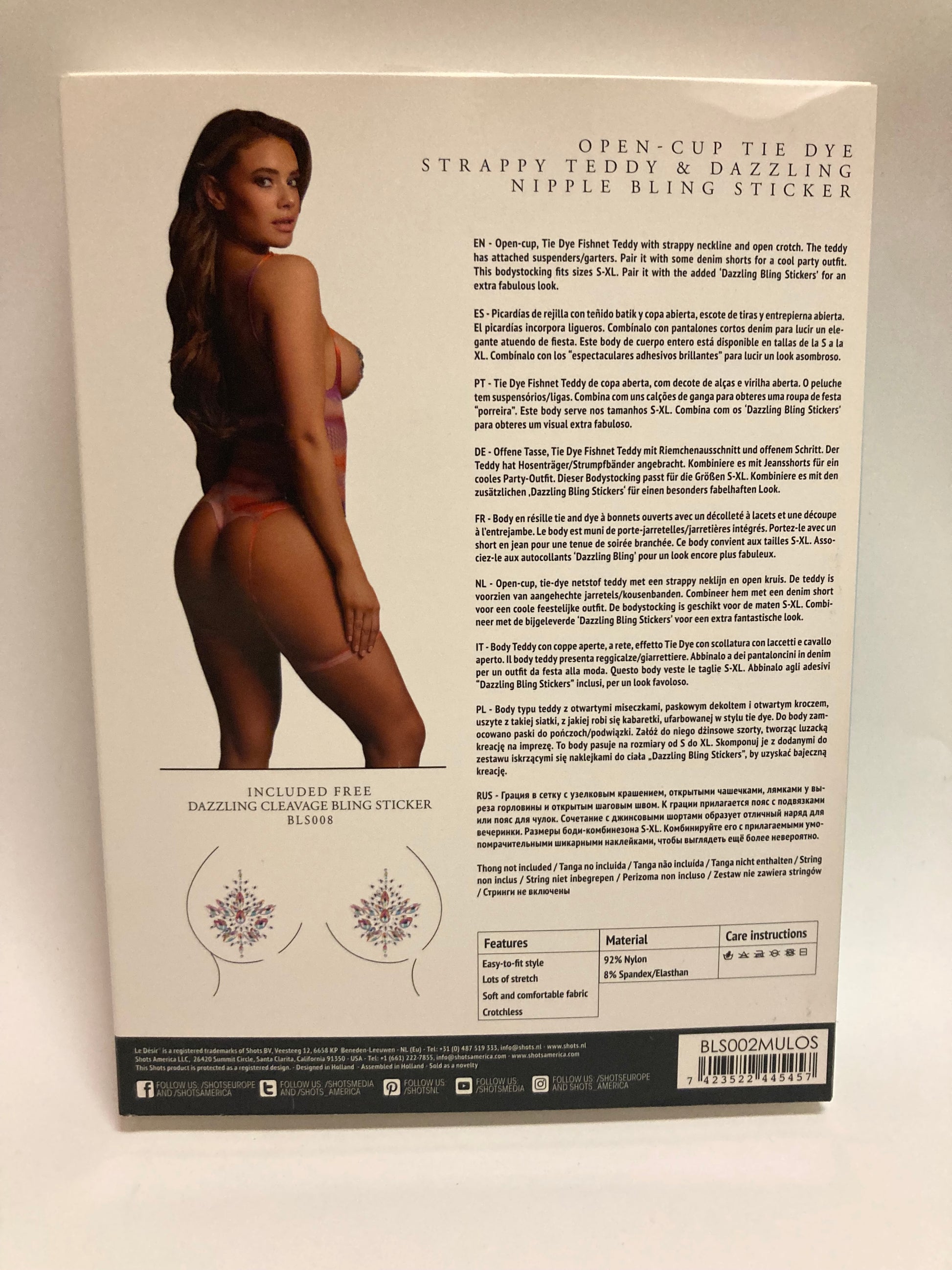 Unleash your wild side with Le Désir Open-Cup Tie Dye Strappy Teddy & Nipple Bling! This unique teddy features an open-cup design, strappy neckline, and crotchless fit, perfect for a daring and playful look. Complete your outfit with the included 'Dazzling Bling Stickers' and turn heads wherever you go. One size fits most. Thong not included