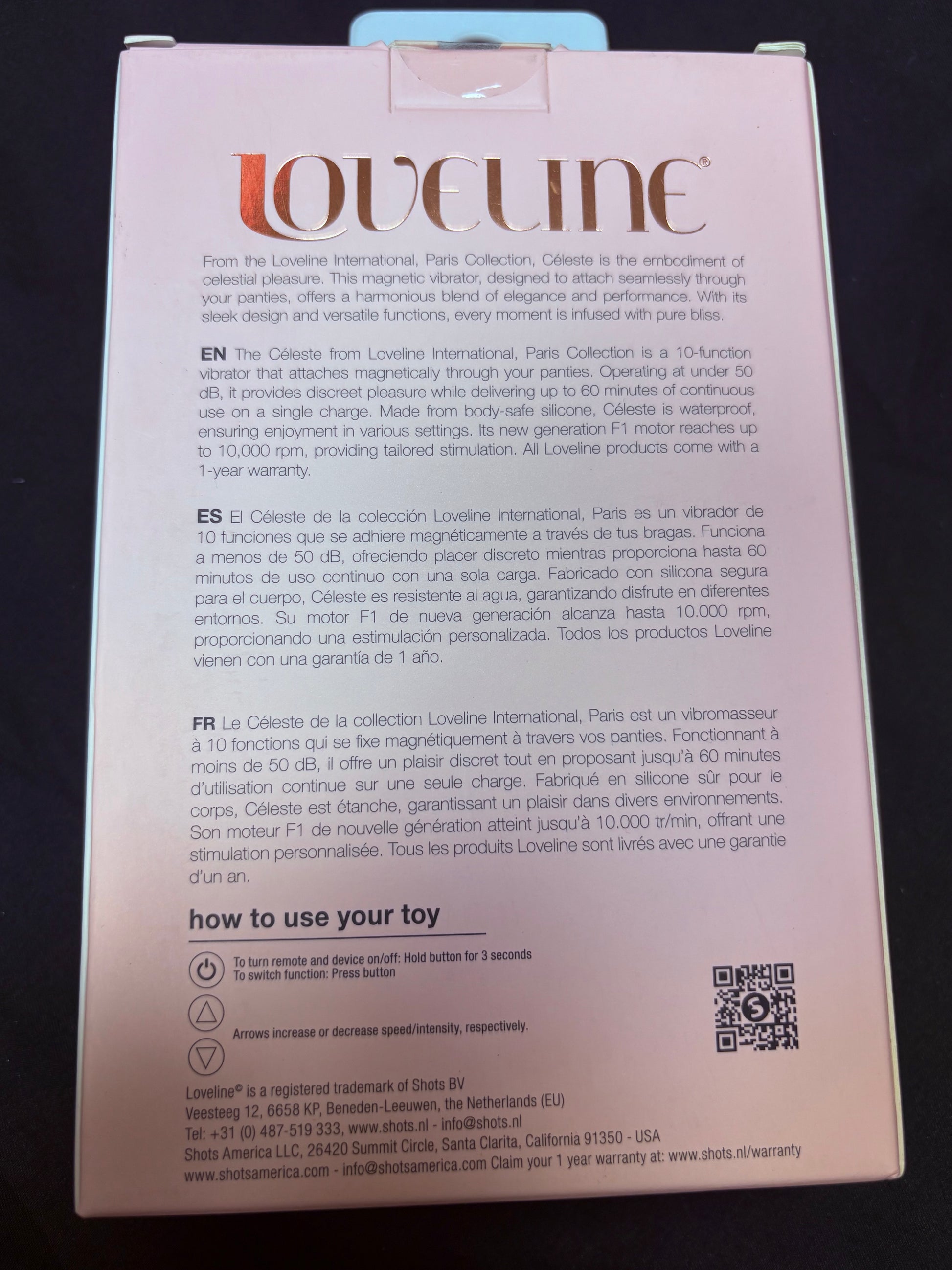 Elevate your intimate moments with the Loveline Céleste Remote Control Panty Vibe. Designed to fit comfortably in your favorite panties, its smooth, contoured silicone shape stays securely in place with a discreet magnetic clip. Enjoy ten thrilling vibration patterns controlled easily by the vibe or remote, perfect for hands-free pleasure anytime, anywhere. Made from skin-safe silicone, Céleste is simple to clean and compatible with water-based lubricants for added comfort. Experience discreet, intense sensations that transform date night or solo play into something unforgettable.