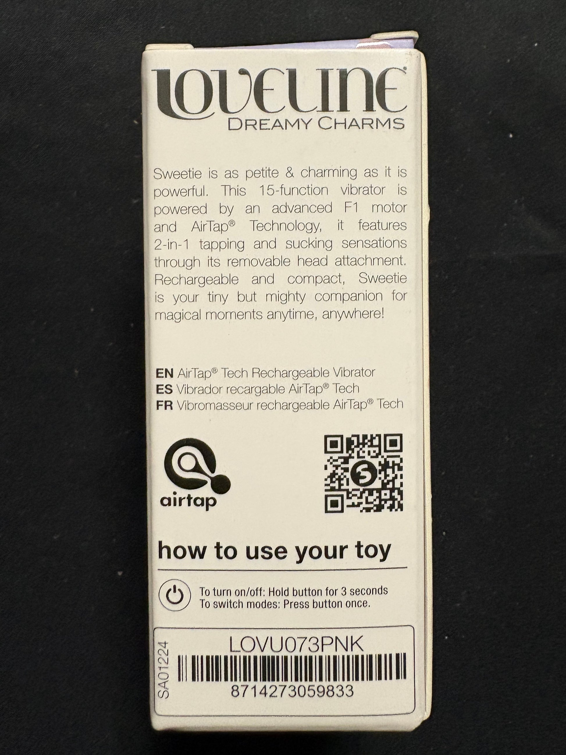 She’s adorable, compact, and ready to join your adventures… Sweetie is your tiny powerhouse delivering major pleasure in a delightfully petite size! This pocket-friendly wonder offers 15 enchanting modes and blends AirTap® Technology with a soft, removable sucking head for a fresh sensation. Fueled by a whisper-quiet F1 motor, Sweetie brings discreet, buzzing excitement wherever you go. Perfect for tossing in your purse, sliding into a bedside drawer, or pulling out whenever the mood strikes. Small, dreamy, and always ready to play. Crafted from silky, body-safe silicone and sturdy ABS plastic, Sweetie cleans up easily with toy cleaner and warm water. Pair with water-based lube and recharge via the magnetic cable for nonstop fun.