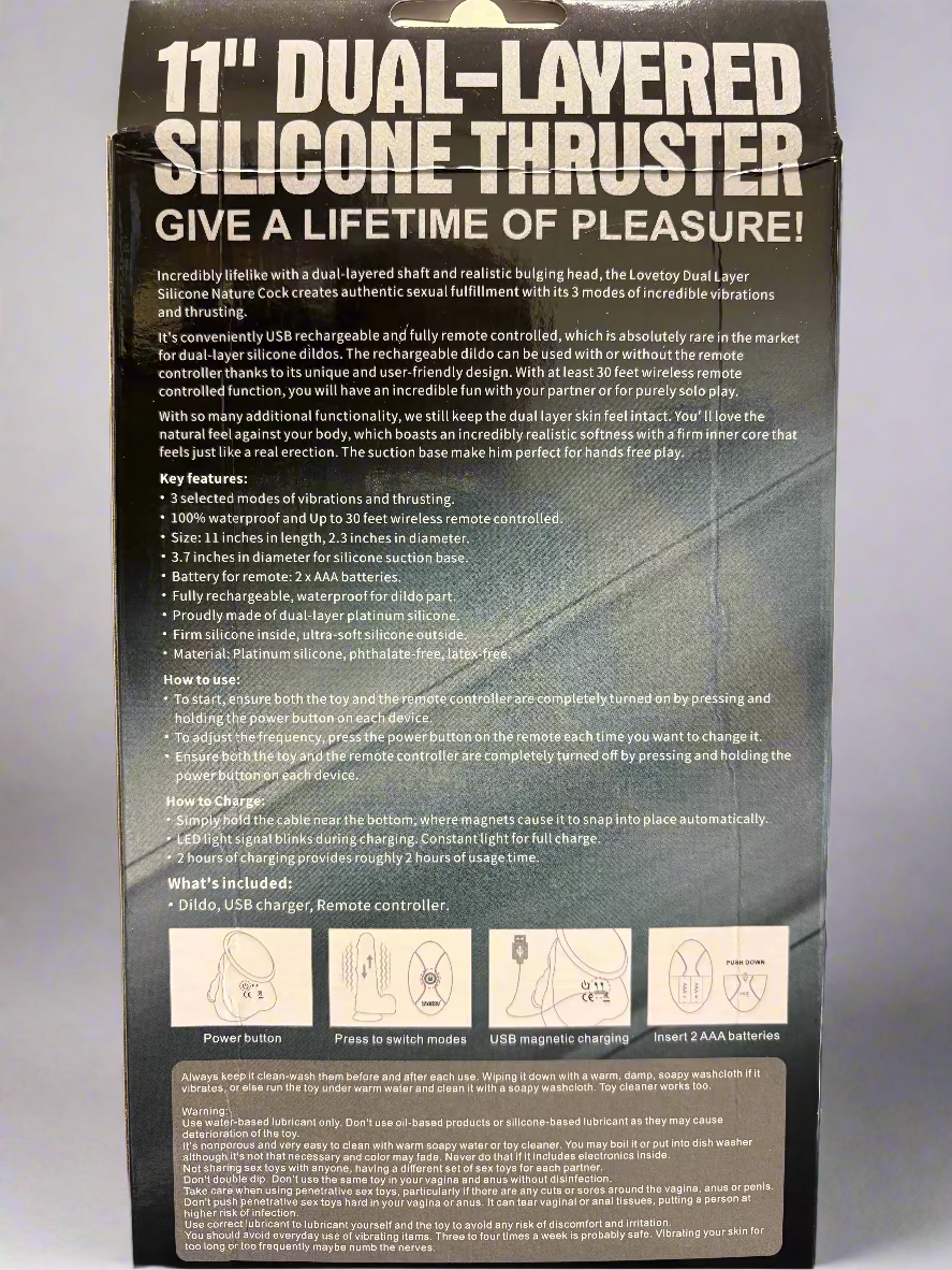 Experience true realism with the LoveToy Dual-Layered Nature Thrusting Cock Vibrator, featuring a lifelike dual-layered shaft and a pronounced, realistic head. It offers three powerful vibration and thrusting modes for ultimate pleasure. USB rechargeable and uniquely remote-controlled with up to 30 feet wireless range, it’s perfect for solo sessions or partner play. The intuitive design allows use with or without the remote. Enjoy its natural skin-like softness combined with a firm inner core that mimics a real erection. The suction base adds versatility for hands-free enjoyment, making every moment unforgettable.