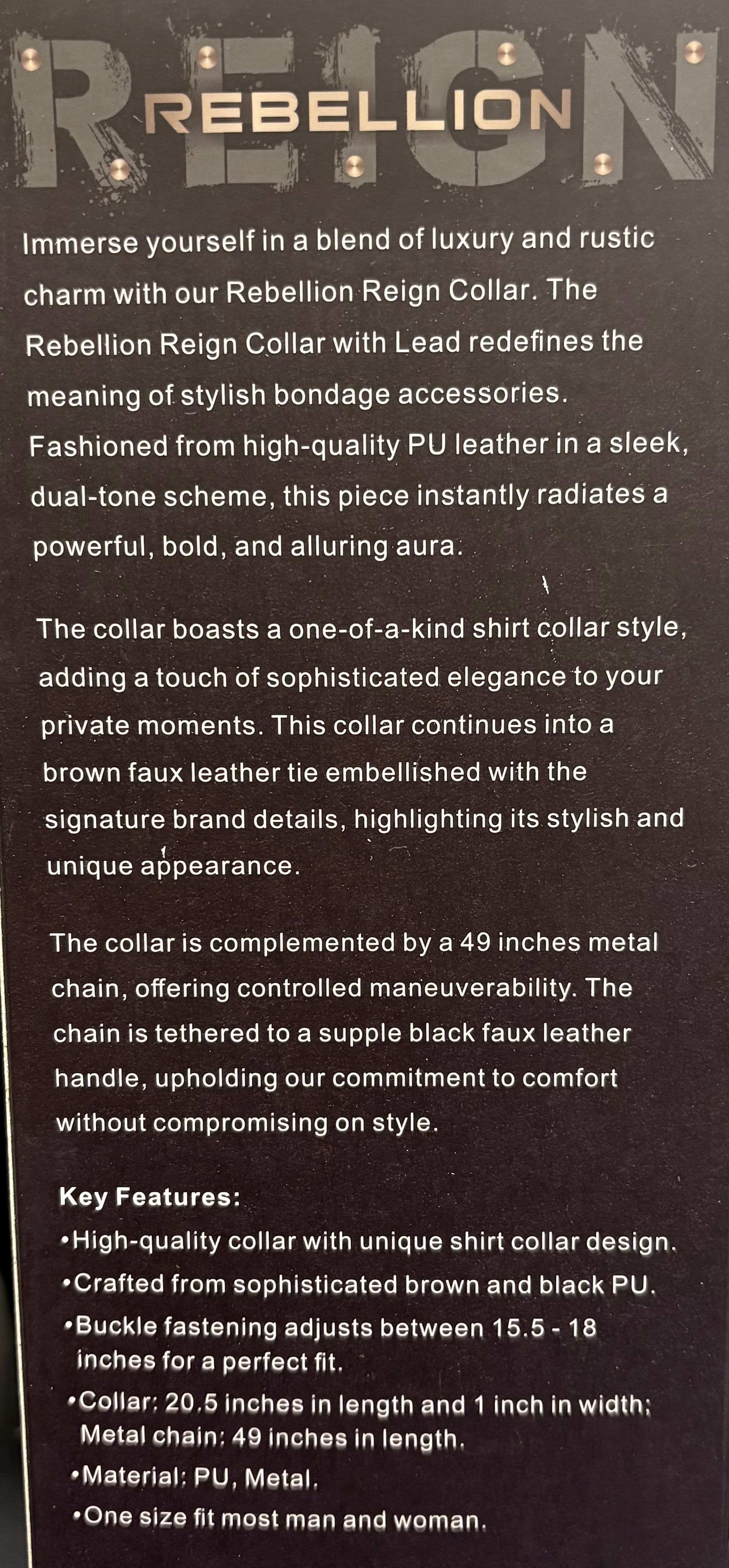 Step into a world where luxe meets edgy with the Rebellion Reign Collar. Crafted from premium PU leather in a chic dual-tone design, this collar exudes confidence and flair. Featuring a unique shirt collar look, it adds a dash of classy mischief to your intimate play. A brown faux leather tie, adorned with signature brand accents, completes the standout style. Attached is a 49-inch metal chain for smooth control, ending with a soft black faux leather handle that keeps comfort front and center. Perfect for those who like their accessories bold and fun!