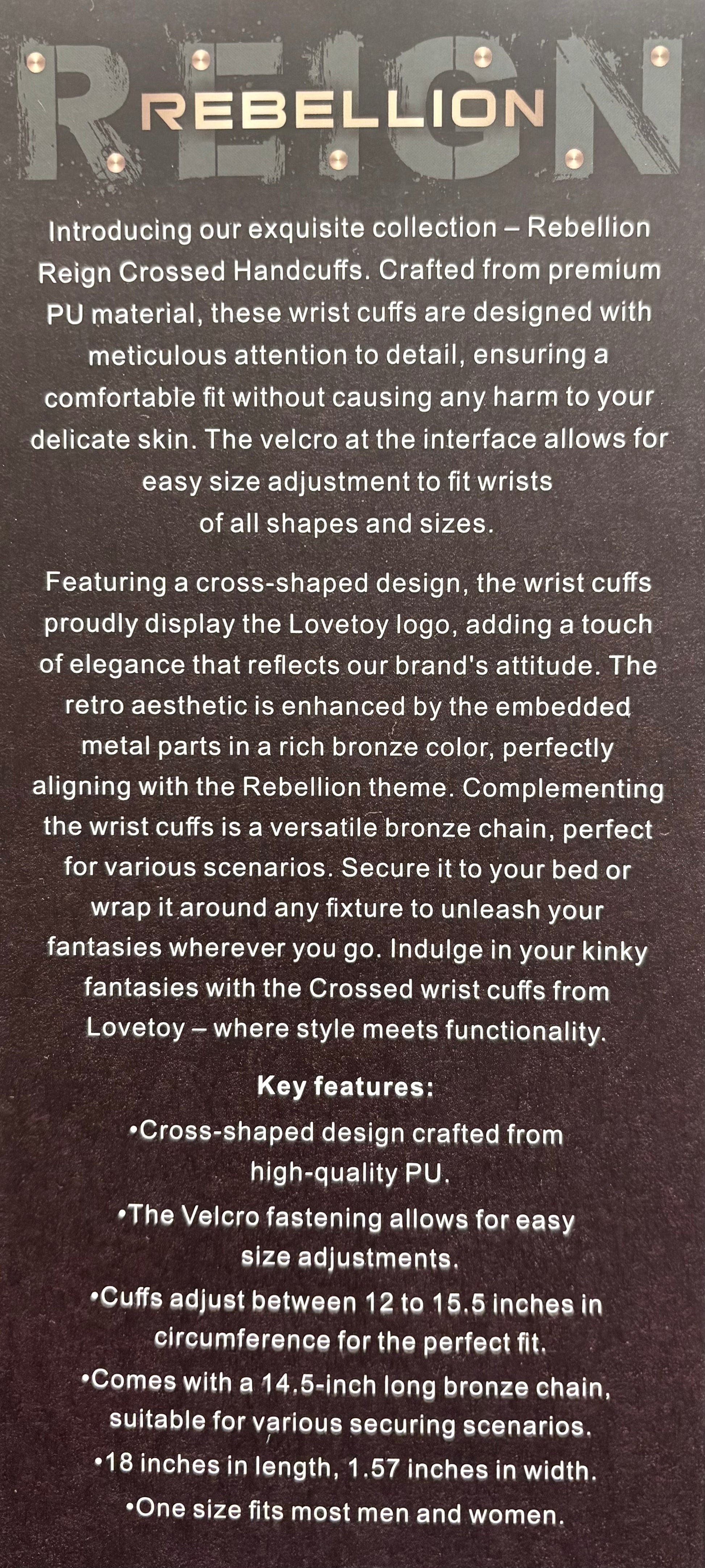 Meet the Rebellion Reign Crossed Handcuffs—a playful twist on classic restraint. Made from soft, premium PU, these cuffs hug your wrists comfortably without irritation. Adjustable velcro lets you find the perfect fit for any wrist. Their eye-catching crossed design shows off the Lovetoy logo with a retro vibe, highlighted by bold bronze metal accents. The included bronze chain adds versatility—attach it to your bed or any sturdy spot to spice things up anytime, anywhere. Embrace your adventurous side with these stylish and functional cuffs from Lovetoy!