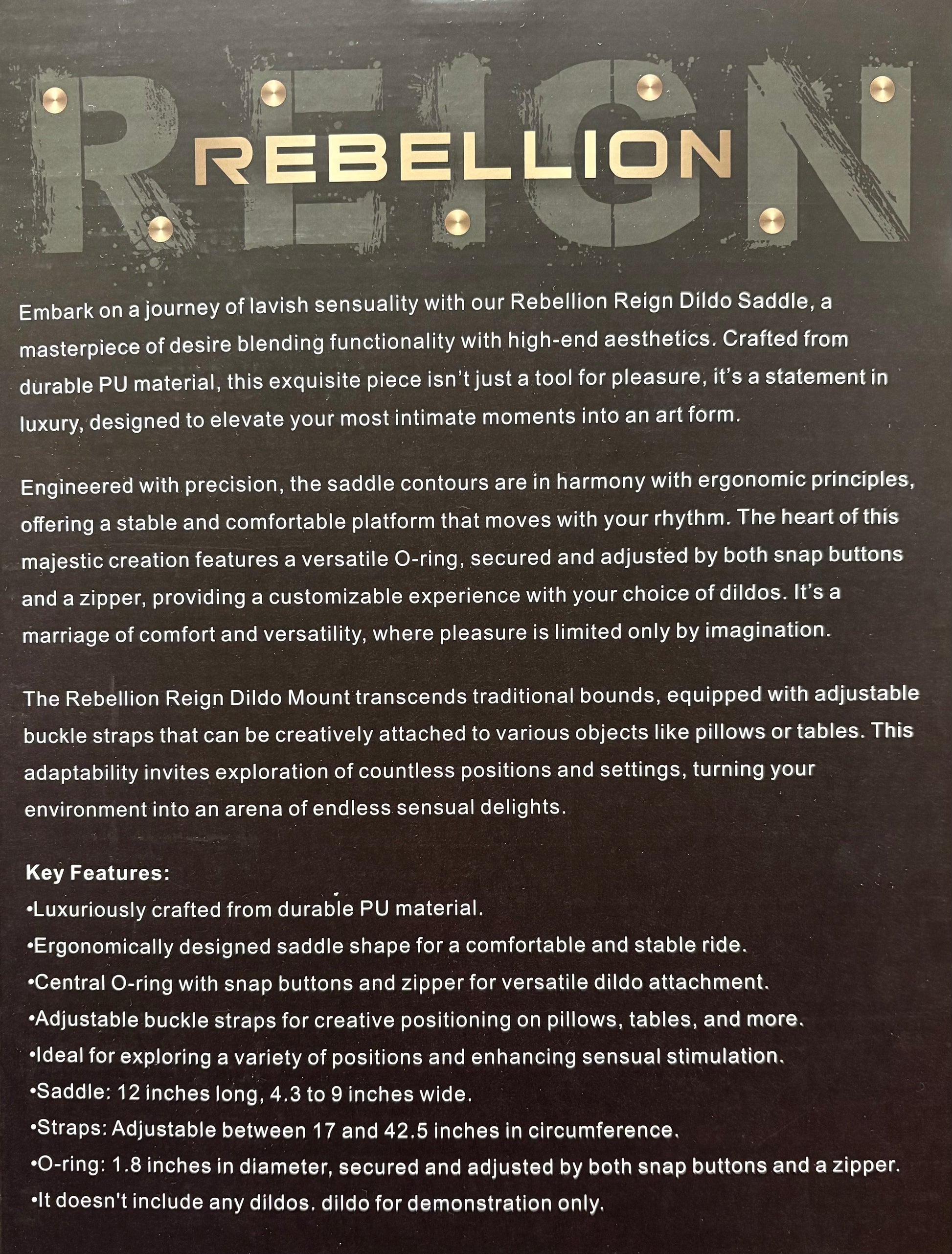 Dive into decadent pleasure with the Rebellion Reign Dildo Saddle—a stunning fusion of function and flair. Made from sturdy PU material, this luxurious piece transforms intimacy into an indulgent experience. Its ergonomic design offers a secure, comfy fit that moves naturally with you. Featuring a clever O-ring secured by snap buttons and a zipper, it easily adapts to your favorite dildos for endless fun. Adjustable buckle straps let you fasten it to pillows, tables, or more, unlocking a playground of creative positions and thrilling adventures. Let your desires run wild with this versatile sensation!