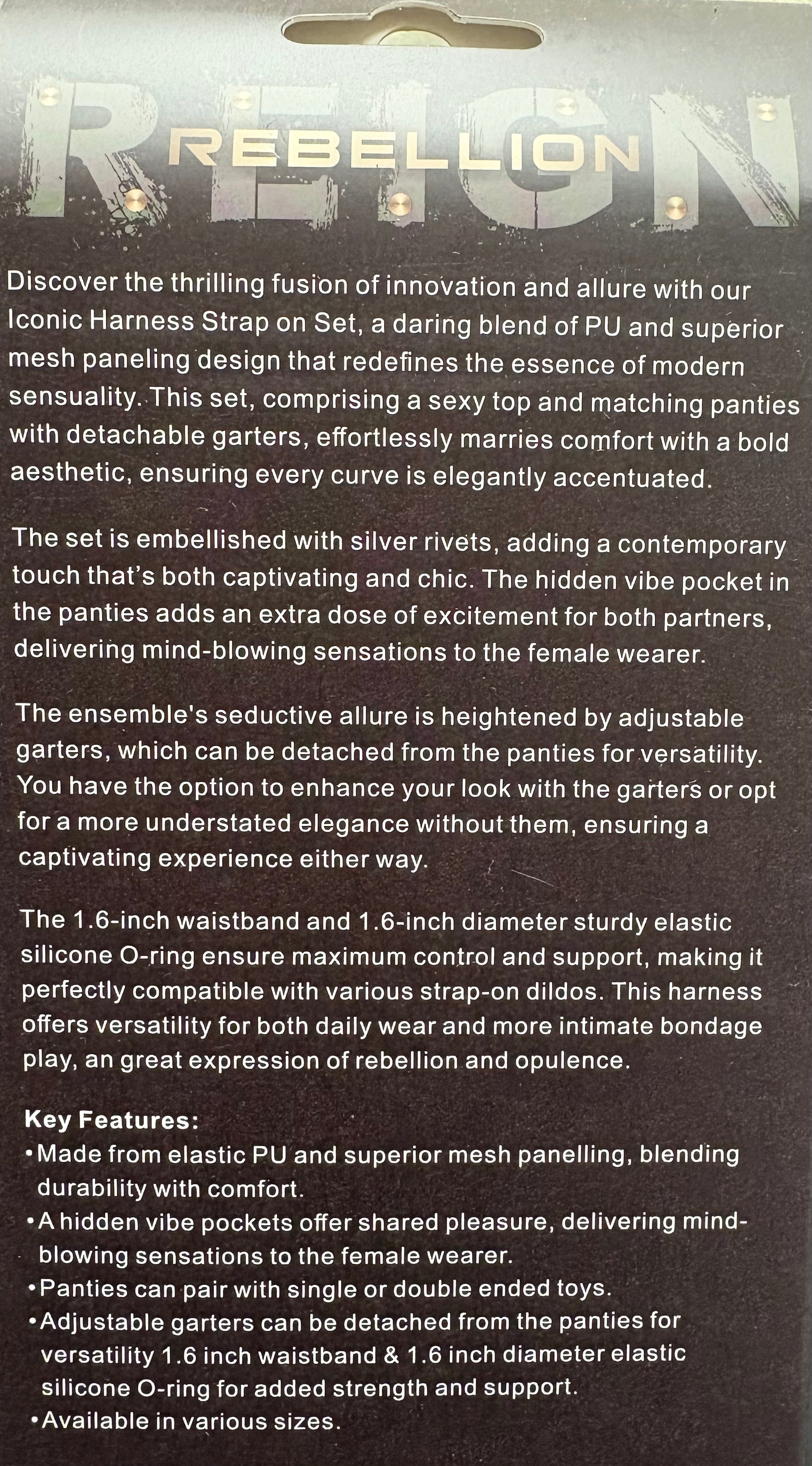 Unleash your daring side with the Iconic Harness Strap-On Set, where edgy PU meets sleek mesh for a seductive, modern twist. This playful set includes a flirty top and matching panties with detachable garters, designed to highlight your curves with comfort and style. Silver rivets add a trendy edge, while a secret vibe pocket in the panties spices up your pleasure. Adjustable garters give you the freedom to switch from bold to subtle looks. With a sturdy silicone O-ring and supportive waistband, this harness fits perfectly with various strap-on dildos, ready for anything from everyday fun to adventurous play.