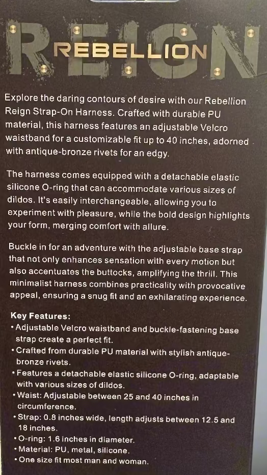 Dive into bold pleasure with the Rebellion Reign Strap-On Harness. Made from sturdy PU material and featuring an adjustable Velcro waistband that fits up to 40 inches, this harness is both tough and tailor-made for you. Antique-bronze rivets add a rebellious edge, while the detachable elastic silicone O-ring fits a range of dildo sizes for endless play. The adjustable base strap not only enhances sensation with every move but also lifts and shapes your curves, blending comfort with a daring look. Ready for a thrilling ride? This harness is your perfect partner in adventure.