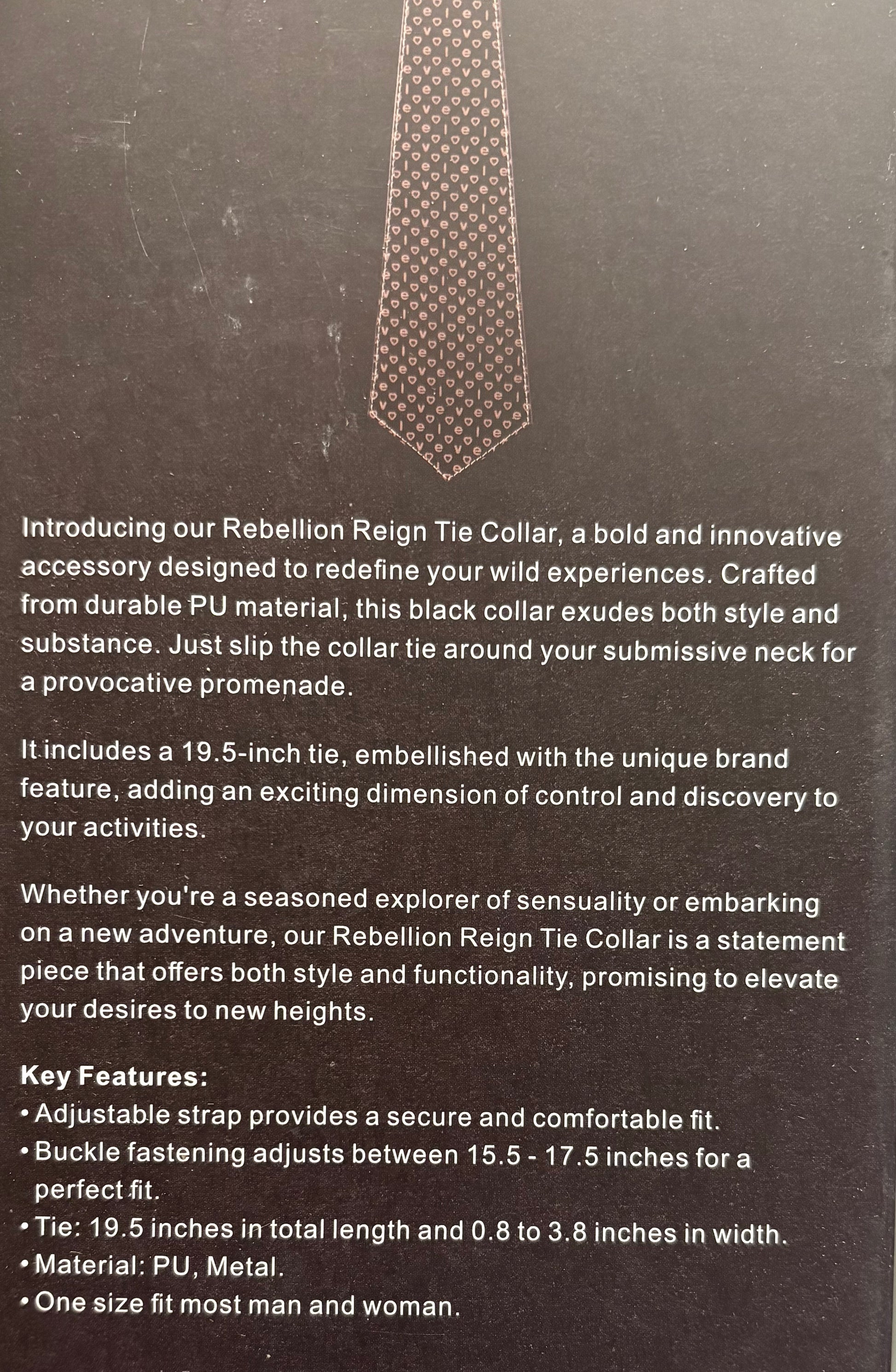Meet the Rebellion Reign Tie Collar—a daring and stylish addition to your playful collection. Made from sturdy black PU material, this collar wraps comfortably around your submissive's neck, turning every moment into an exciting exploration. Featuring a 19.5-inch tie decorated with our signature brand touch, it brings a thrilling mix of control and fun to your intimate adventures. Whether you're well-versed in passion or just starting to experiment, this collar combines flair and function to ignite your wildest fantasies.