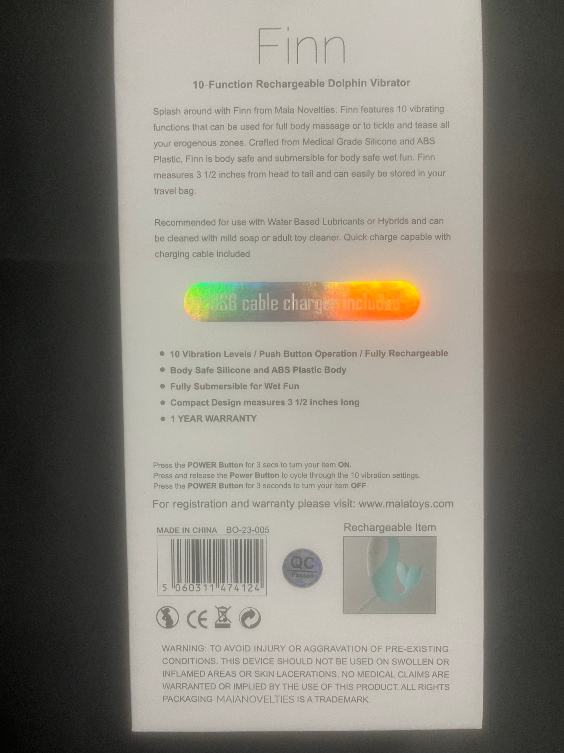 Experience endless pleasure with the Maia Finn Dolphin Mini Vibe. Made of super-smooth silicone and featuring ten vibration modes, this versatile and compact vibe can be used to stimulate hot spots all over the body. Its sturdy core ensures steady and precise stimulation, while the soft tail adds an extra level of excitement. USB rechargeable and waterproof, Finn is easy to clean and safe for your body.
