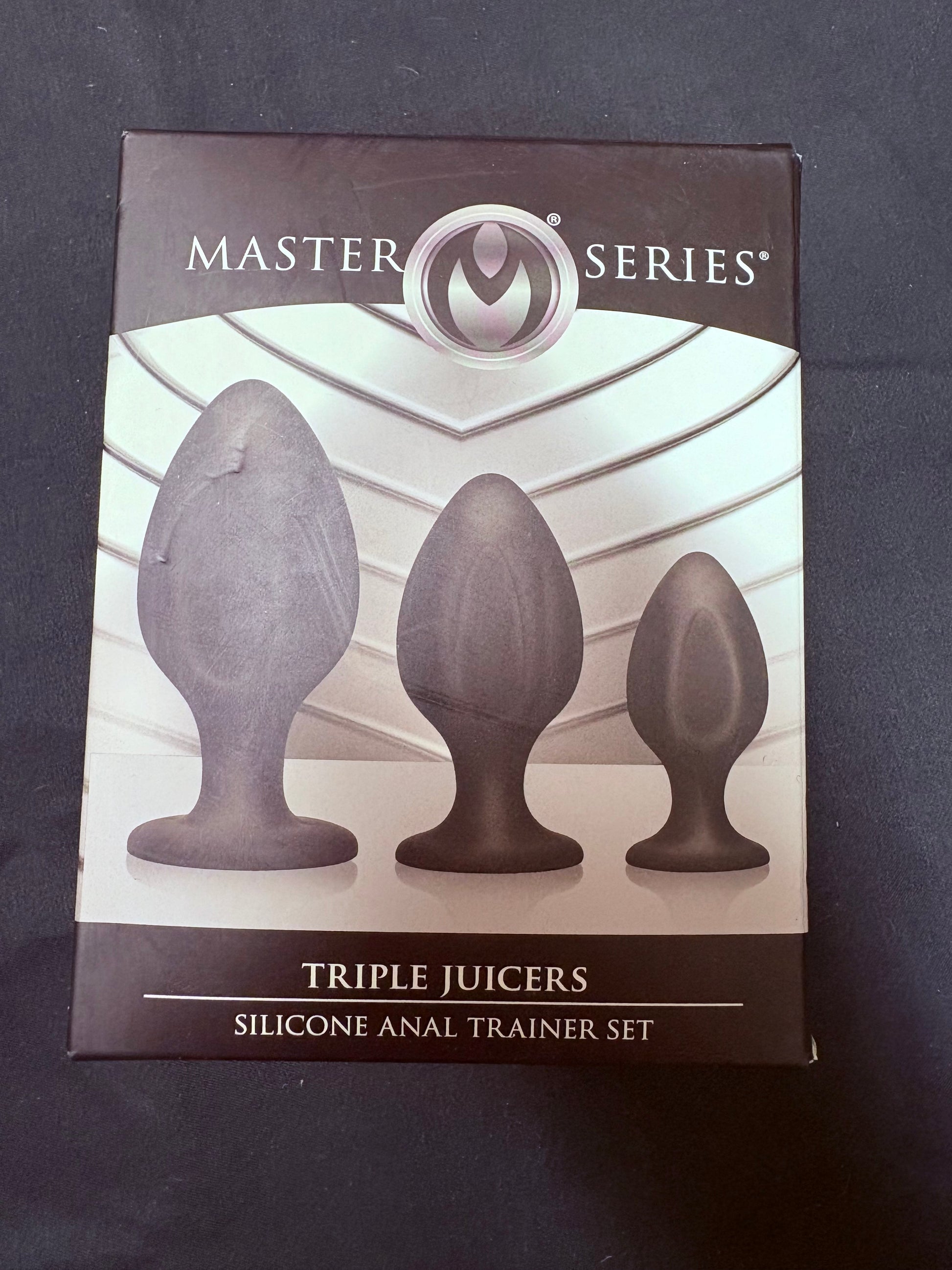 Discover the Master Series Triple Juicers Anal Trainer Set, crafted from premium body-safe silicone for comfort and safety. This set includes three uniquely textured plugs, varying in size from petite to more filling, each with a smooth rounded tip for easy insertion and a secure suction base for slip-free control. The distinct ridges and dips provide heightened sensations, and the twistable base lets you spin the textured bumps for intensified pleasure. Perfect for both beginners easing into new sensations and experienced users seeking exciting stimulation. Elevate your experience with this versatile and expertly designed trainer set.