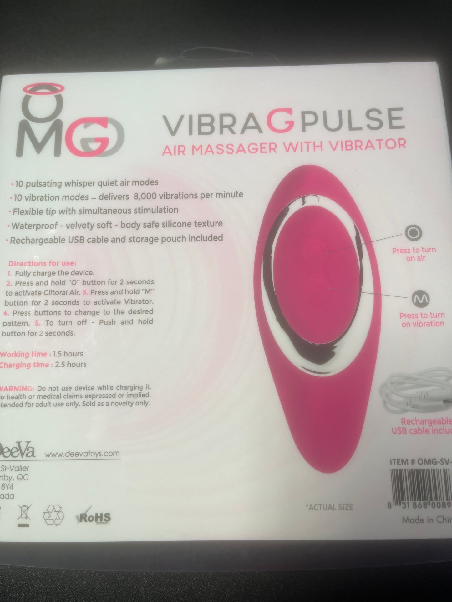 The OMG Vibra G Pulse Air Massager is a versatile and convenient addition to any self-care routine. It features a combination of clitoral suction and a vibrating probe to stimulate both the clitoris and g-spot simultaneously. With its rechargeable design, this innovative toy offers endless pleasure without the hassle of batteries.