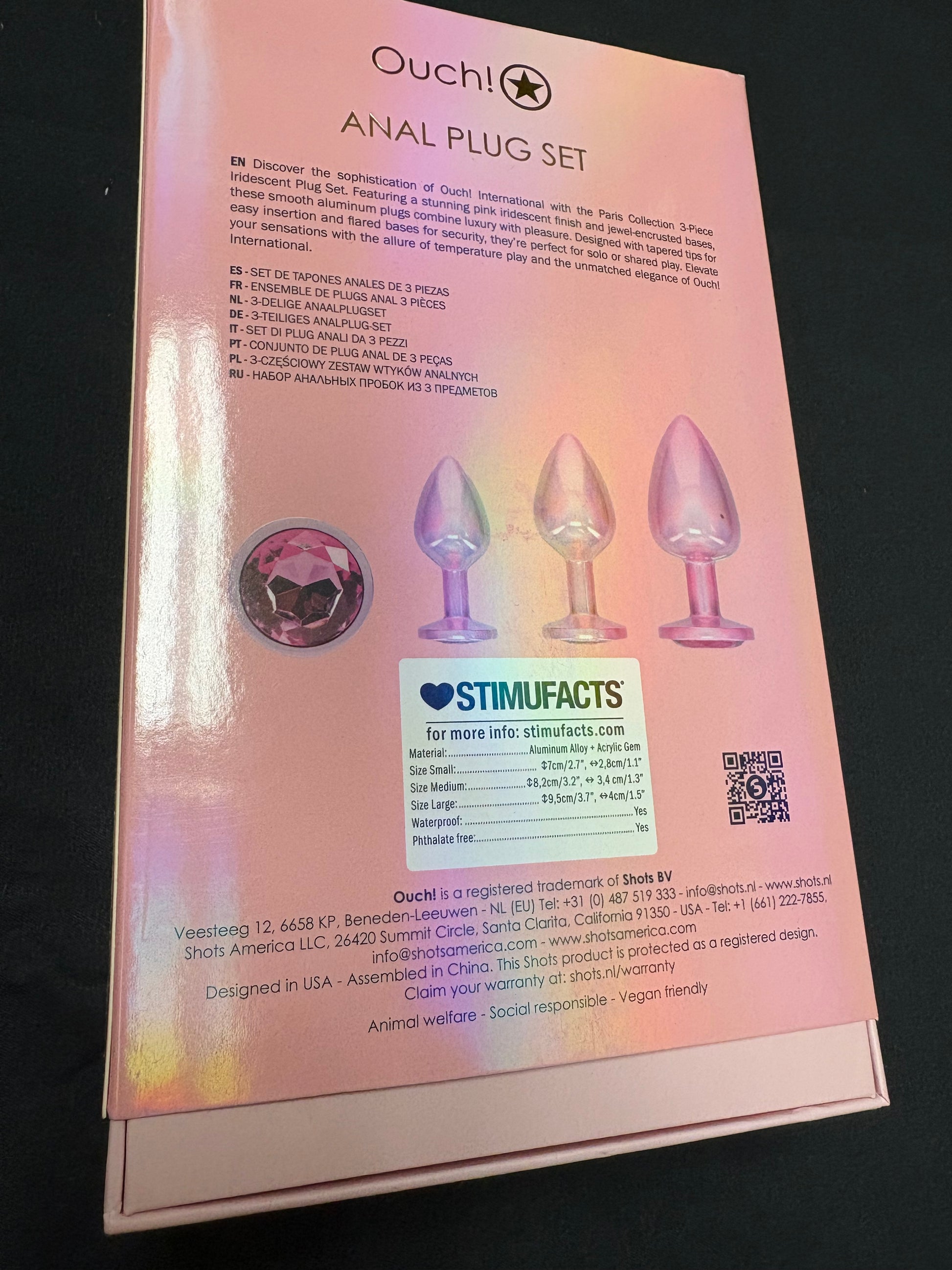 Elevate your intimate moments with the Ouch! Paris Collection Metal Anal Plug Set. Perfect for all experience levels, this set features three beautifully crafted aluminum plugs—small, medium, and large—each with a tapered tip for gentle, comfortable insertion and a sparkling gem-studded base for a touch of glamour. Their smooth, firm surface ensures easy cleaning and compatibility with any lubricant. Designed for both pleasure and style, these durable plugs invite you to explore with confidence and flair.