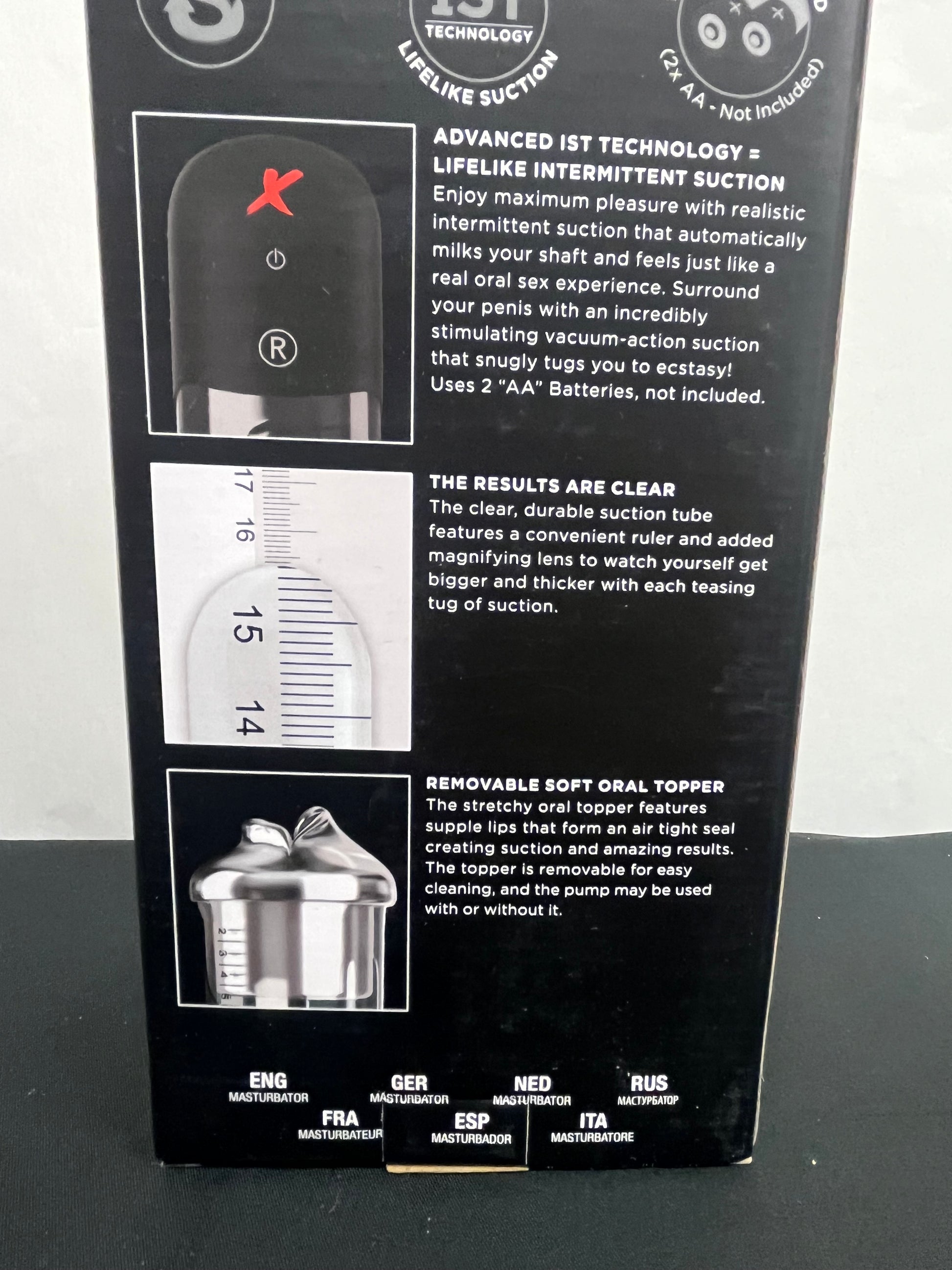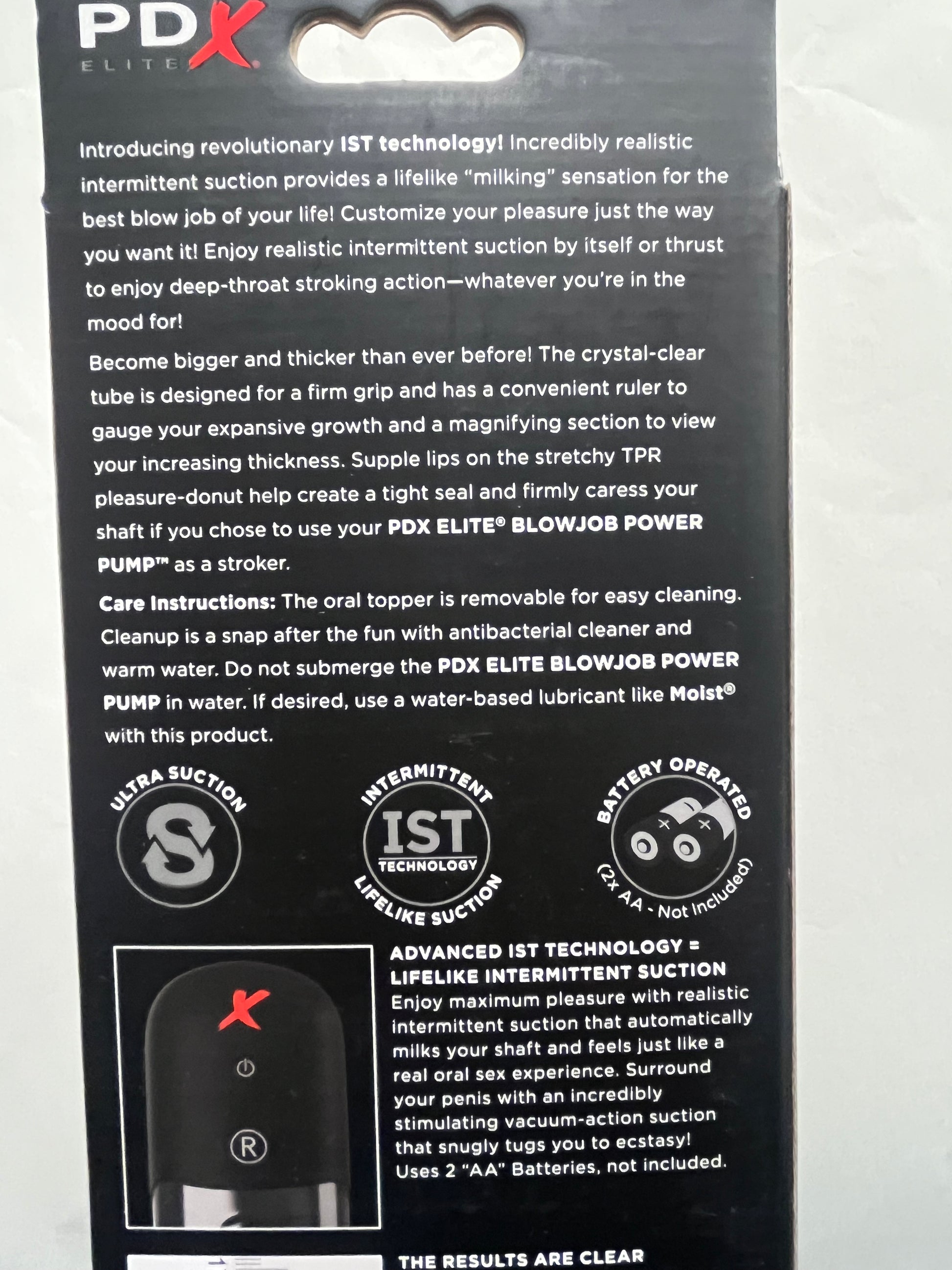 Experience intense pleasure with the PDX Elite Blowjob Power Pump. Its lips use stimulating suction in two modes - steady and intermittent - for a customizable experience. Simply push the power button for intense suction and release with the 'S'. Requires 2 AA batteries (not included) and can be used with water-based lube.