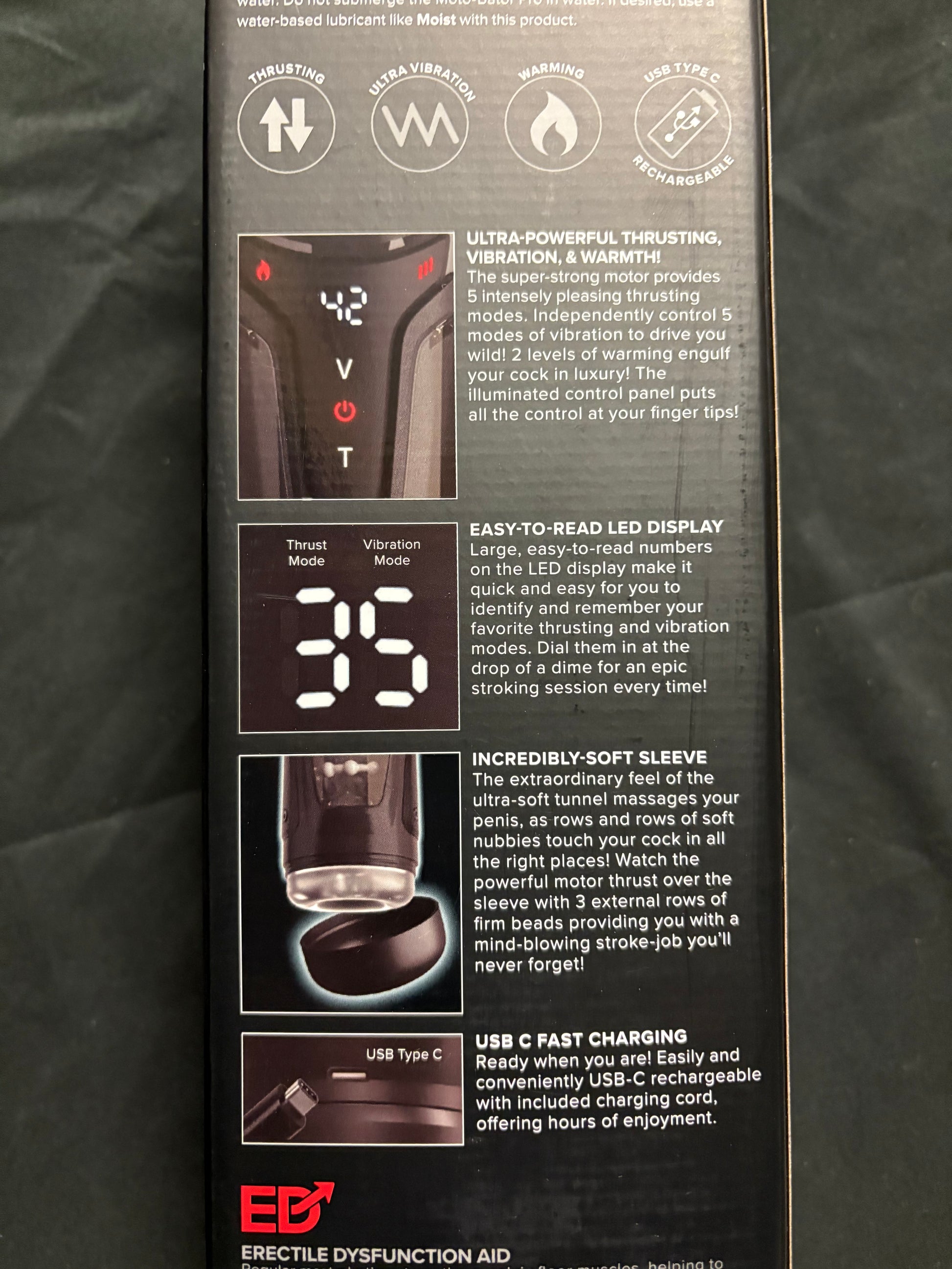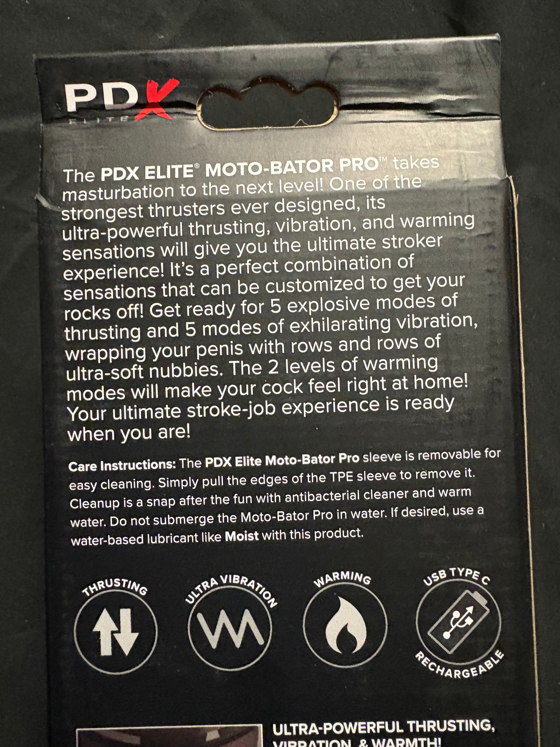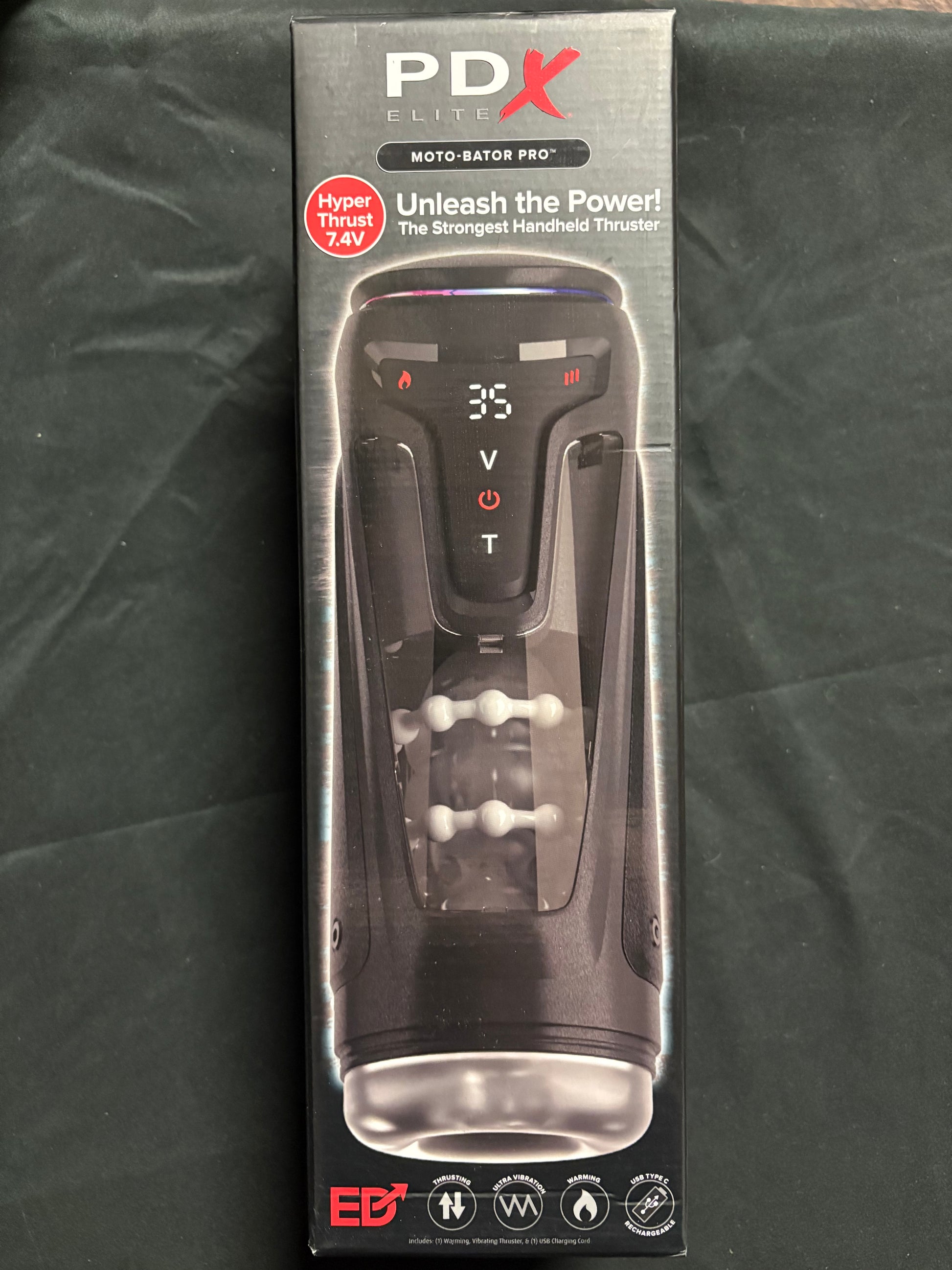 Experience powerful pleasure with the PipeDream PDX Elite Moto-Bator Pro Thrusting Stroker. Inside a sleek case with a tempting viewing window, it delivers intense beaded thrusts, vibration, rich textures, and comforting warmth. Five thrusting modes, five vibration settings, and two warming levels are easily controlled and displayed on the screen for a fully customizable session. Designed for fun and function, it also supports pelvic floor strength—perfect for those who love edging or want to boost their wellness with pleasure. Get ready to feel every thrilling sensation!