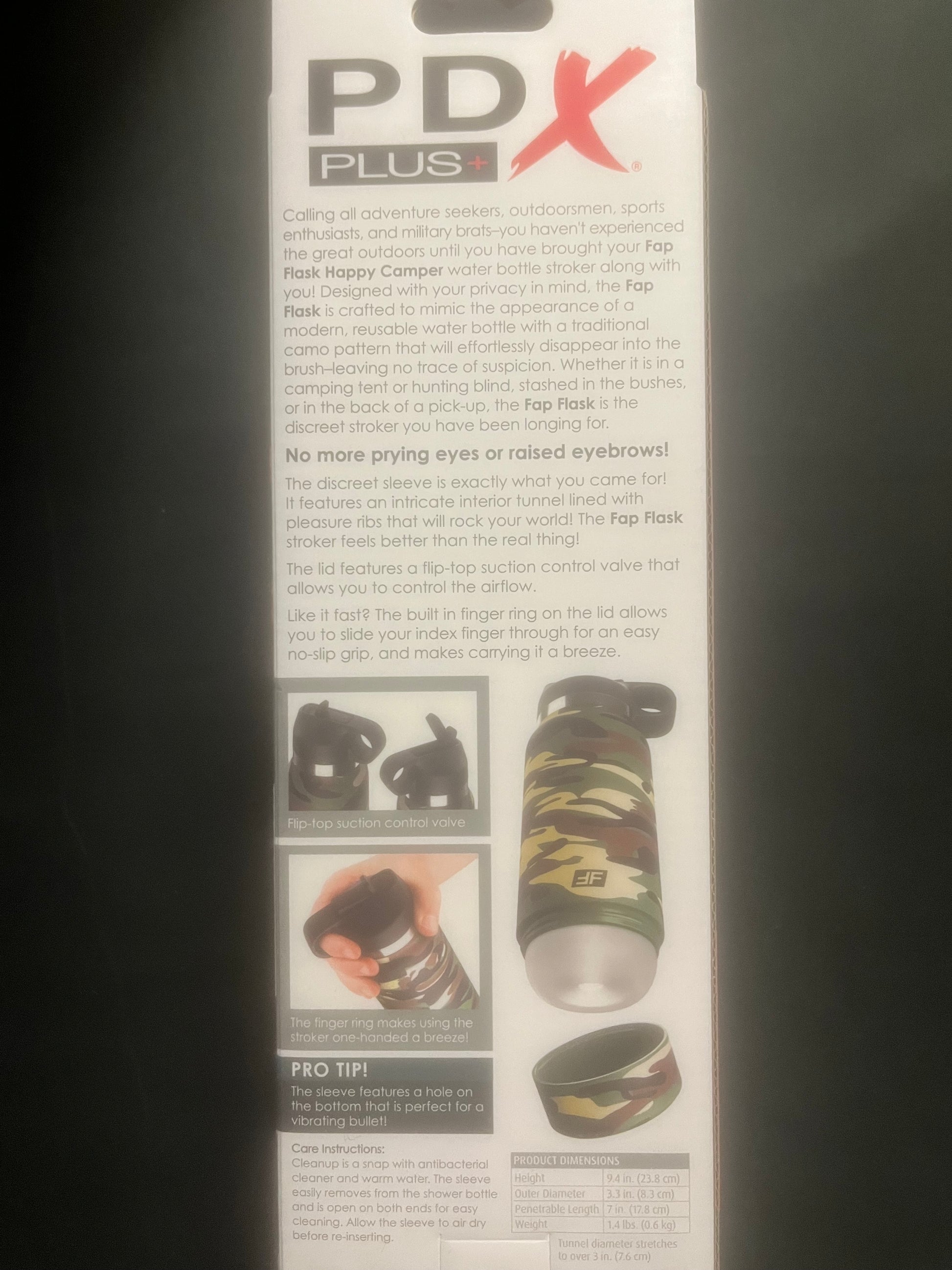 Unlock the ultimate discreet pleasure experience with the PipeDream PDX Plus Fap Flask! Disguised as a traveler flask, this tricky stroker features a soft, texture-filled sleeve that's completely camouflaged until you pop off the base. Adjust the airflow with the 'straw' and easily clean with soap and water. Discover endless possibilities with this body-safe, easy-to-use stroker.