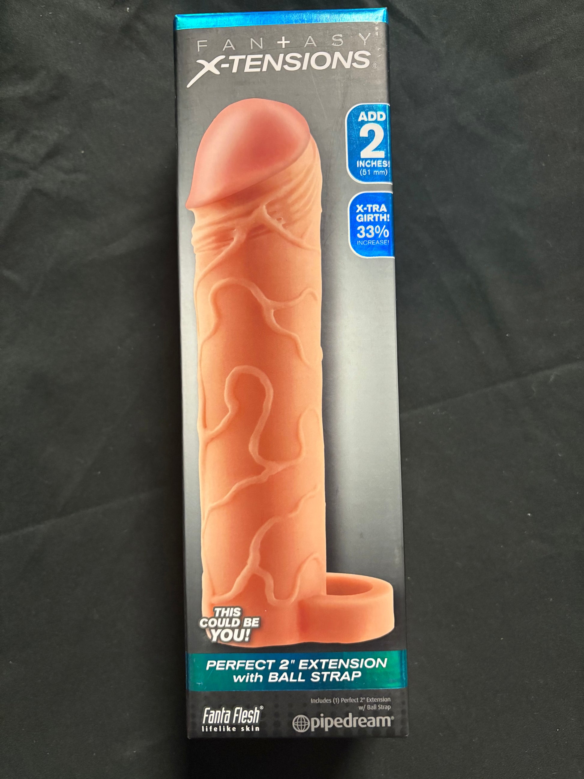 This Pipedream Perfect 2 inch extension and ball strap is designed to enhance the penis by adding length and thickness, while also providing a solution to erectile issues and increasing stamina. Made of soft Fanta Flesh, it offers a comfortable fit with a snug band under the scrotum for secure placement. The realistic texture adds 33% more thickness for a pleasurable experience.