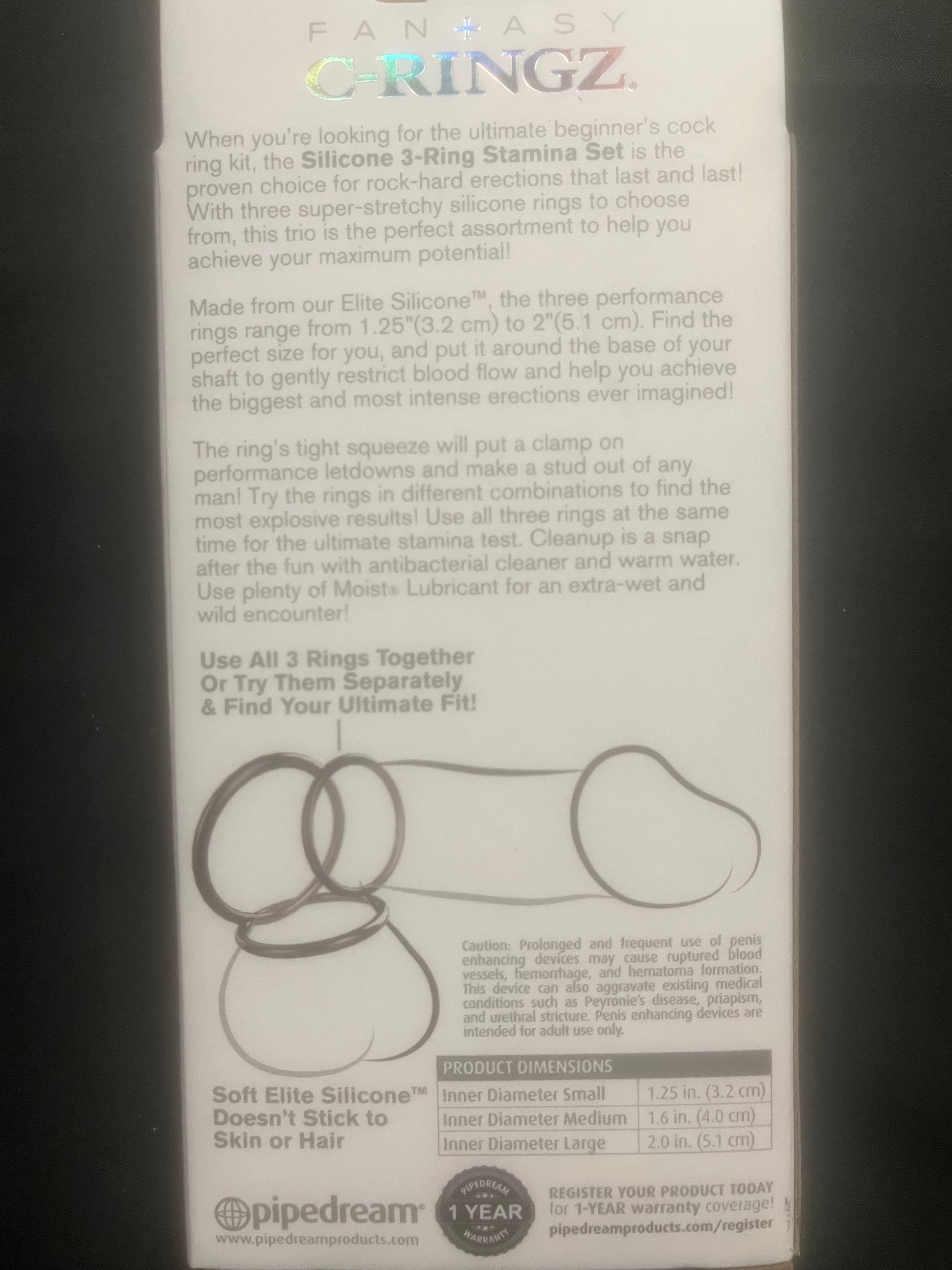 Enhance your pleasure and performance with the PipeDream Silicone 3 Ring Stamina Cock Ring Set. Three sizes offer customizable options for beginners and experts alike, providing increased stamina and stimulation. Made of smooth Elite silicone, these rings are hypoallergenic and easy to clean. Pair with a high-quality water-based lubricant for even more intense sensations.