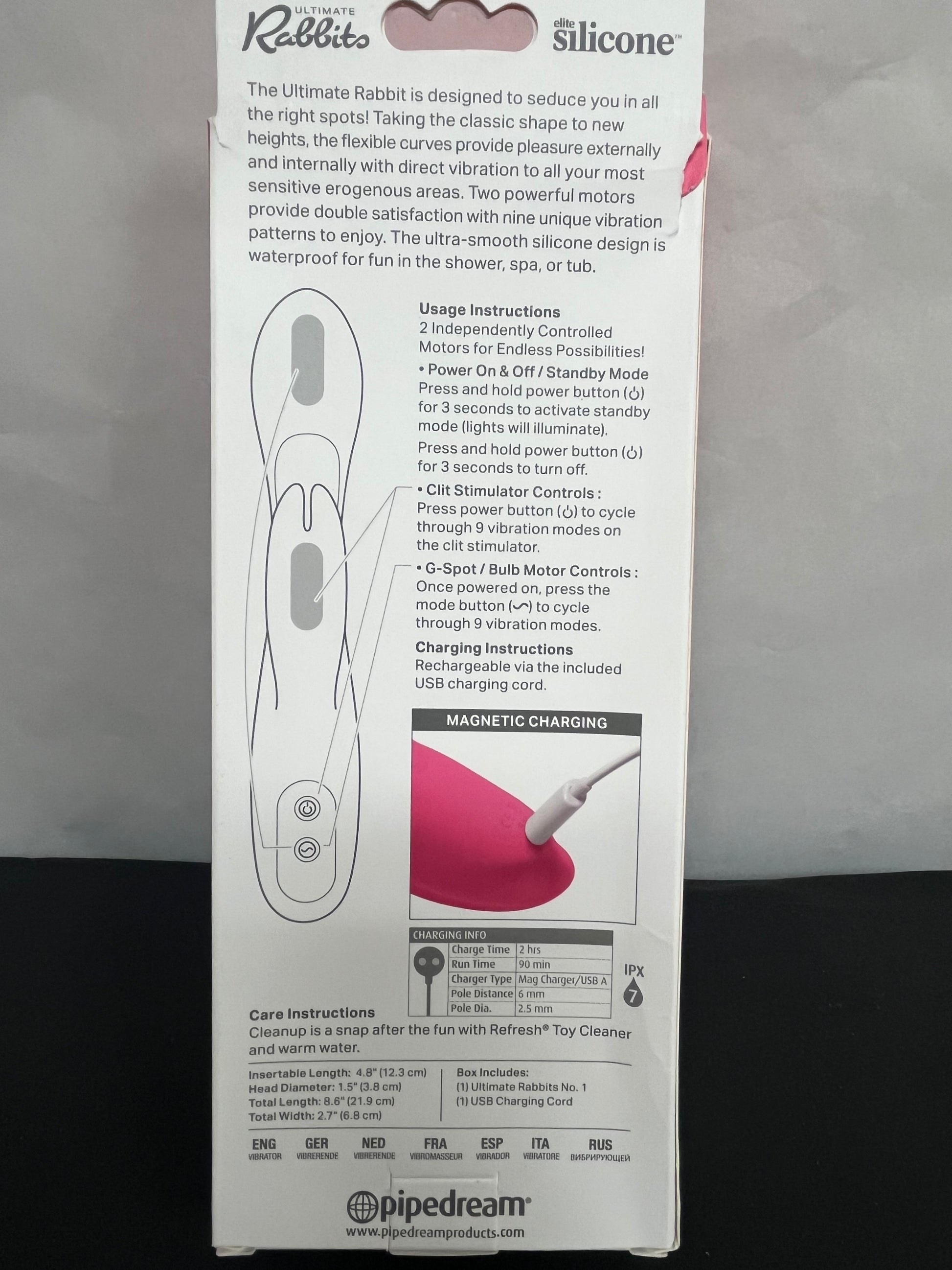 Experience ultimate pleasure with the PipeDream Ultimate Rabbits No. 1 Vibe! With nine varying vibe modes, this fully USB rechargeable toy provides powerful and satisfying sensations. Its body-safe silicone material makes it hypoallergenic and easy to clean. Compatible with any water-based lube and completely waterproof, the No. 1 is the ultimate rabbit vibe for your pleasure.
