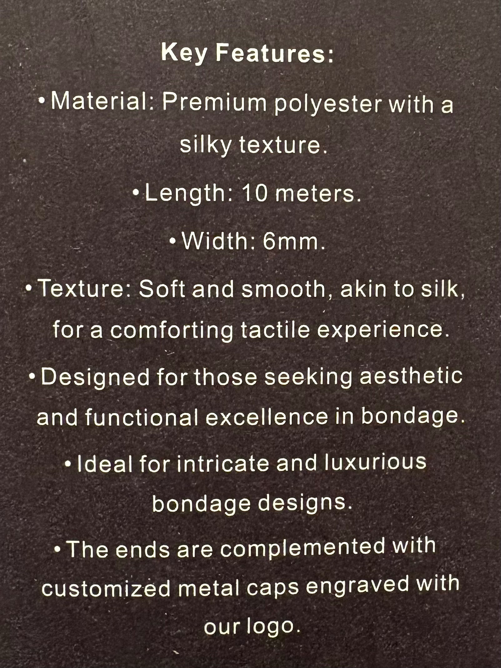 Discover the silky allure of the Rebellion Reign Silky Bondage Rope, crafted from premium polyester for a smooth, sensuous touch that elevates your playtime. At 10 meters long and 6 mm wide, it’s perfect for both straightforward ties and elaborate designs. Its lush texture turns every knot into a tender caress, while the custom metal-capped ends engraved with our logo add a chic edge. Bring a splash of luxury and excitement to your bondage adventures with this irresistible rope.