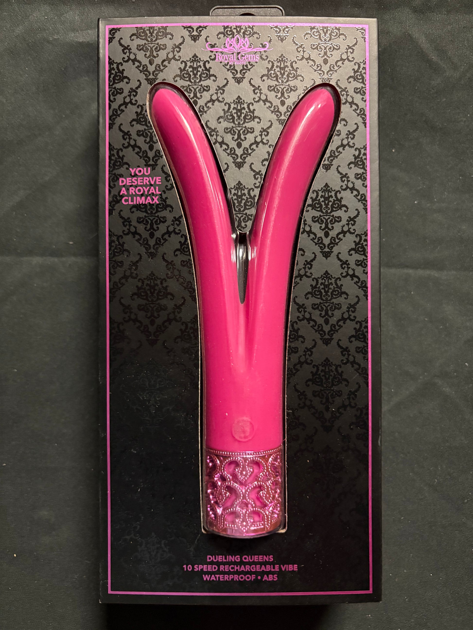 Take the throne in your bedroom (or anywhere your imagination leads!) with the Royal Gems Dueling Queens vibe. It offers two teasing tips that flicker with ten intense vibration patterns, giving you plenty of ways to explore. Use the dual motors independently to target different spots, combine them for focused excitement, or pinch together for some thrilling penetration. The smooth, skin-safe silicone flexes to fit your favorite positions and is easy to clean with soap or toy cleaner. USB rechargeable and splash-proof, this vibe is ready to bring royal pleasure wherever you play!
