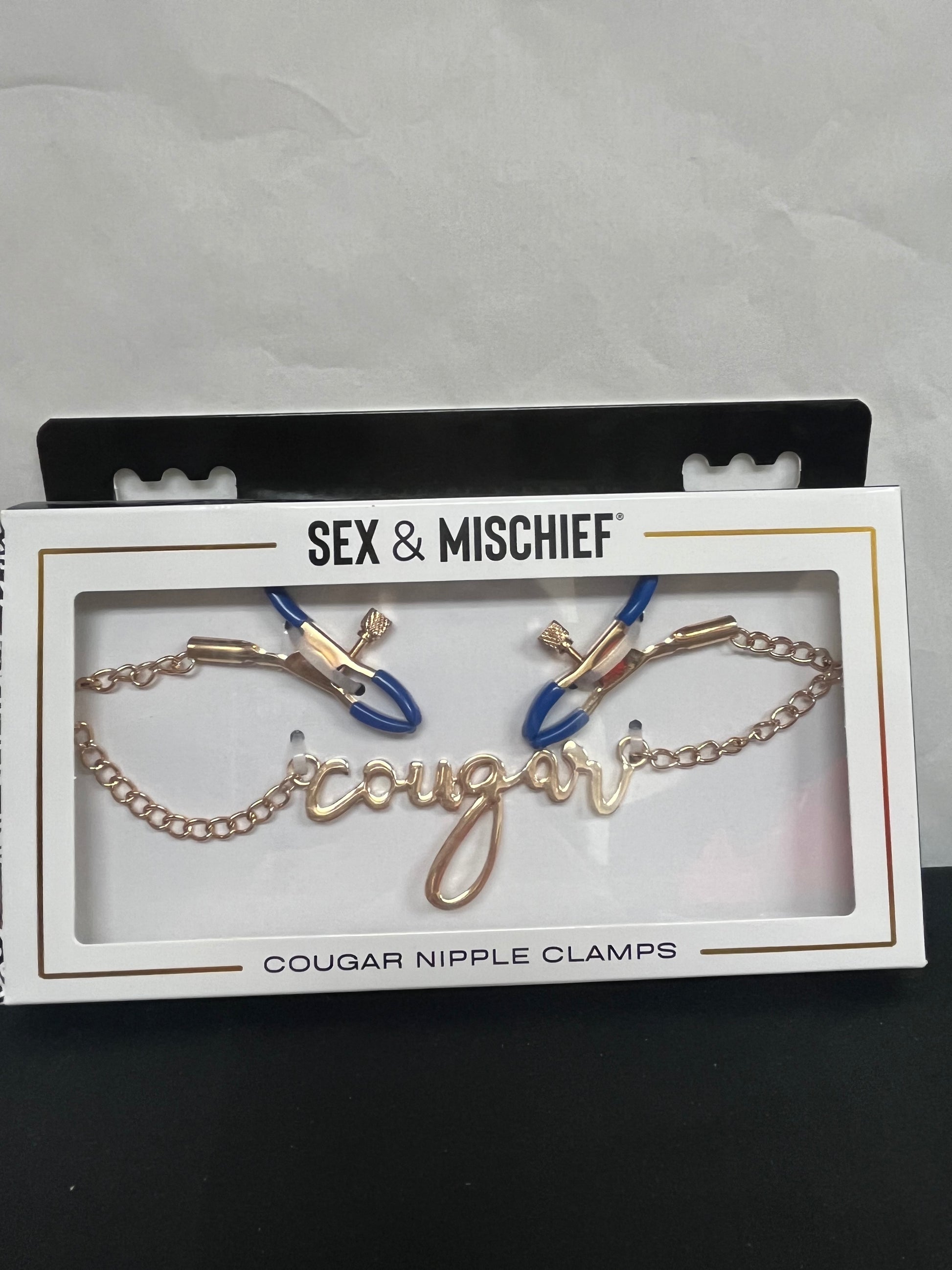 Unleash your inner wildcat with Sex & Mischief's Cougar Nipple Clamps! These alligator-style clamps provide adjustable pressure and soft rubber tips for comfortable wear. Perfect for bondage, seduction, lap dances, and more! Made of nickel-free metal and PVC, they're easy to clean. Length: 16.5" (42cm).