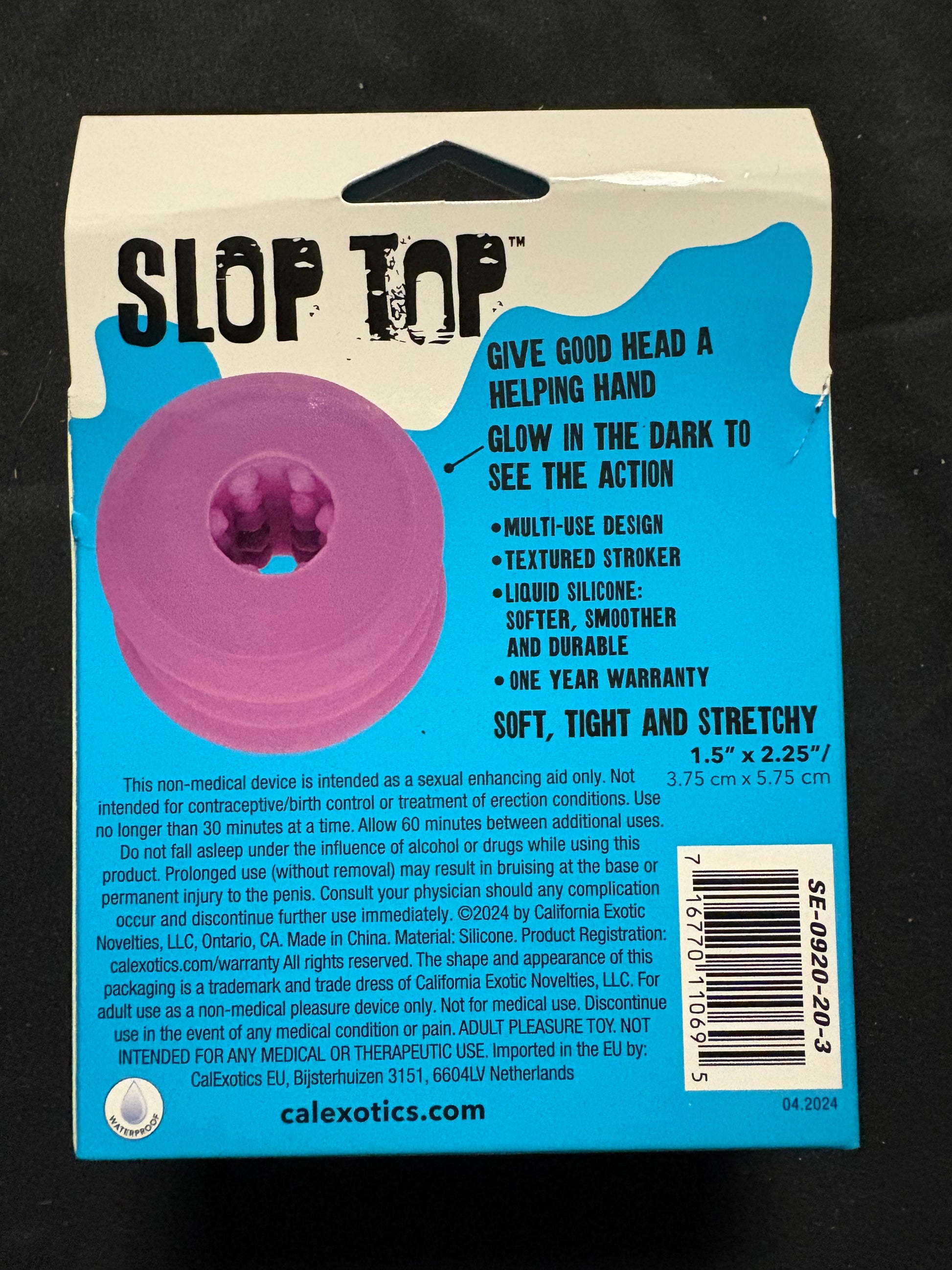 Need a little extra help to spice things up? The Dirty Luv Slop Top from CalExotics offers a fun, textured boost to oral play—and it even glows in the dark! Hold it while going down for double the fun, or use it solo for a slick, satisfying experience. Its snug, squeezable ring is packed with stimulating textures for intense pleasure. Made from body-safe liquid silicone, it's easy to clean and pairs perfectly with any water-based lube. Compact and ready to play, Dirty Luv measures 1.5" by 2.25".