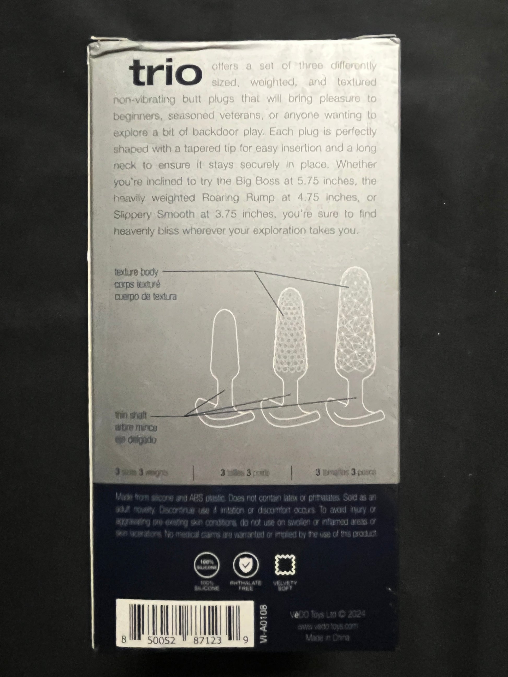 Indulge in the ultimate butt plug experience with the Trio Weighted Butt Plug Kit by VeDo. Made of body-safe silicone, this kit includes three extra weighty plugs in various shapes and sizes for versatile and stimulating play. Whether you're new to butt play or a seasoned pro, this kit has everything you need for endless pleasure.