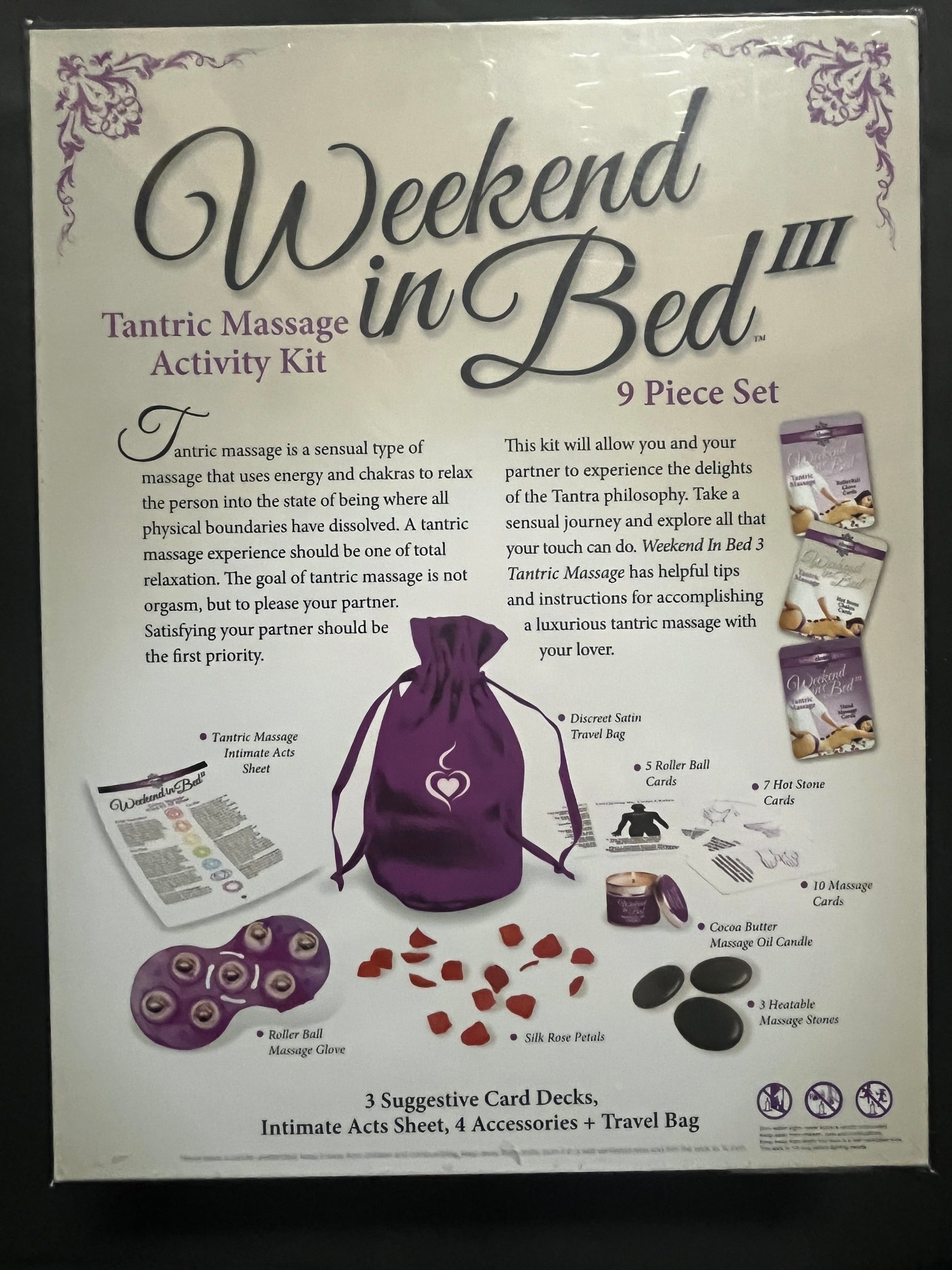 Experience ultimate relaxation and intimacy with the Weekend in Bed 3 Tantric Massage Activity Kit. This travel-friendly set includes massage tip cards, hot stones, a roller ball massage glove, and cocoa butter massage oil candle to set the mood. Perfect for a romantic getaway or a night in, create an unforgettable sensual experience for you and your partner.