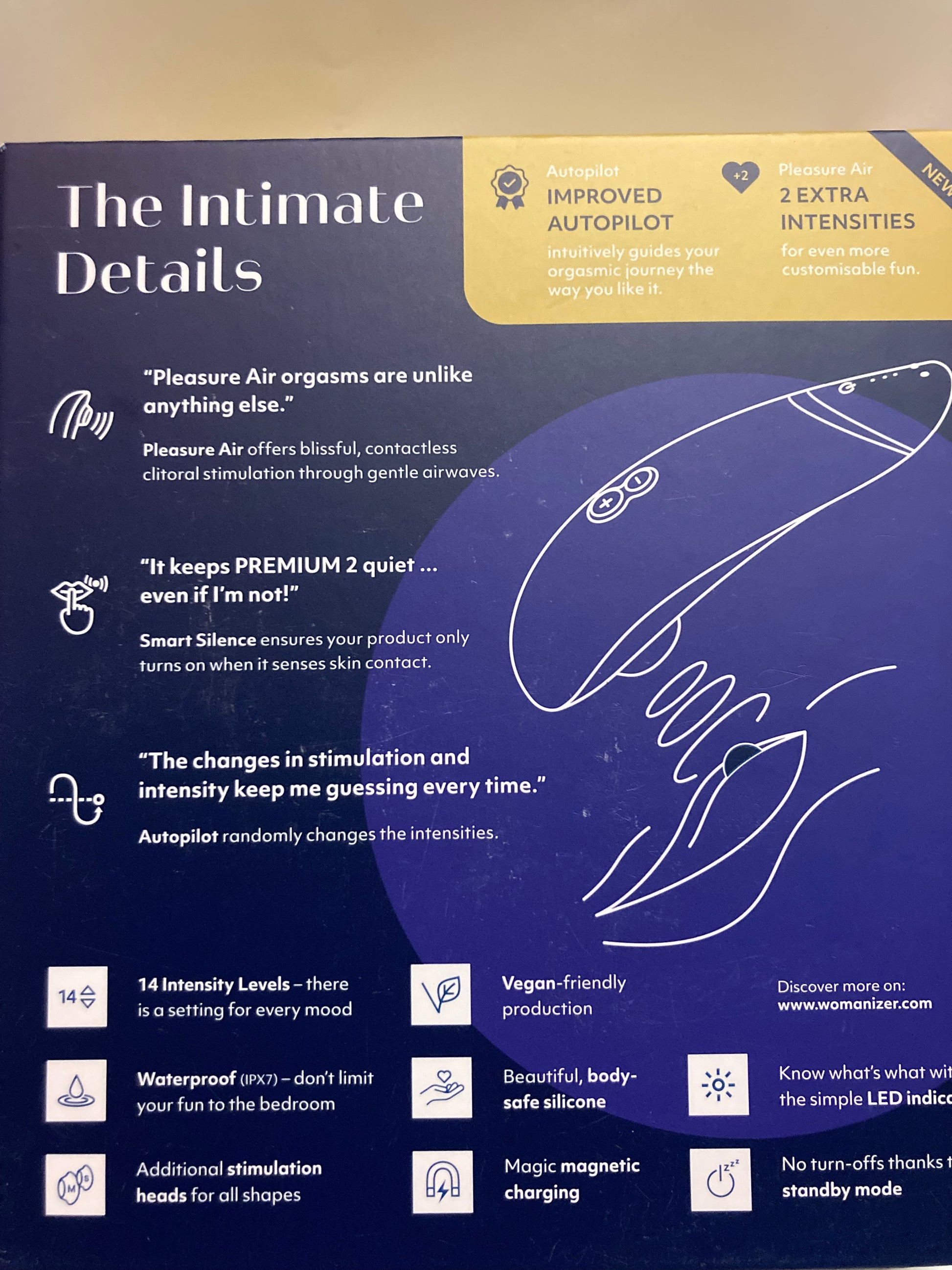 The Womanizer Premium 2 Pleasure Air Stimulator offers a convenient, rechargeable design that powers up using a magnetic USB cable. Made with hypoallergenic silicone, it is body safe, easy to clean, and waterproof. Compatible with water-based lubricants only.